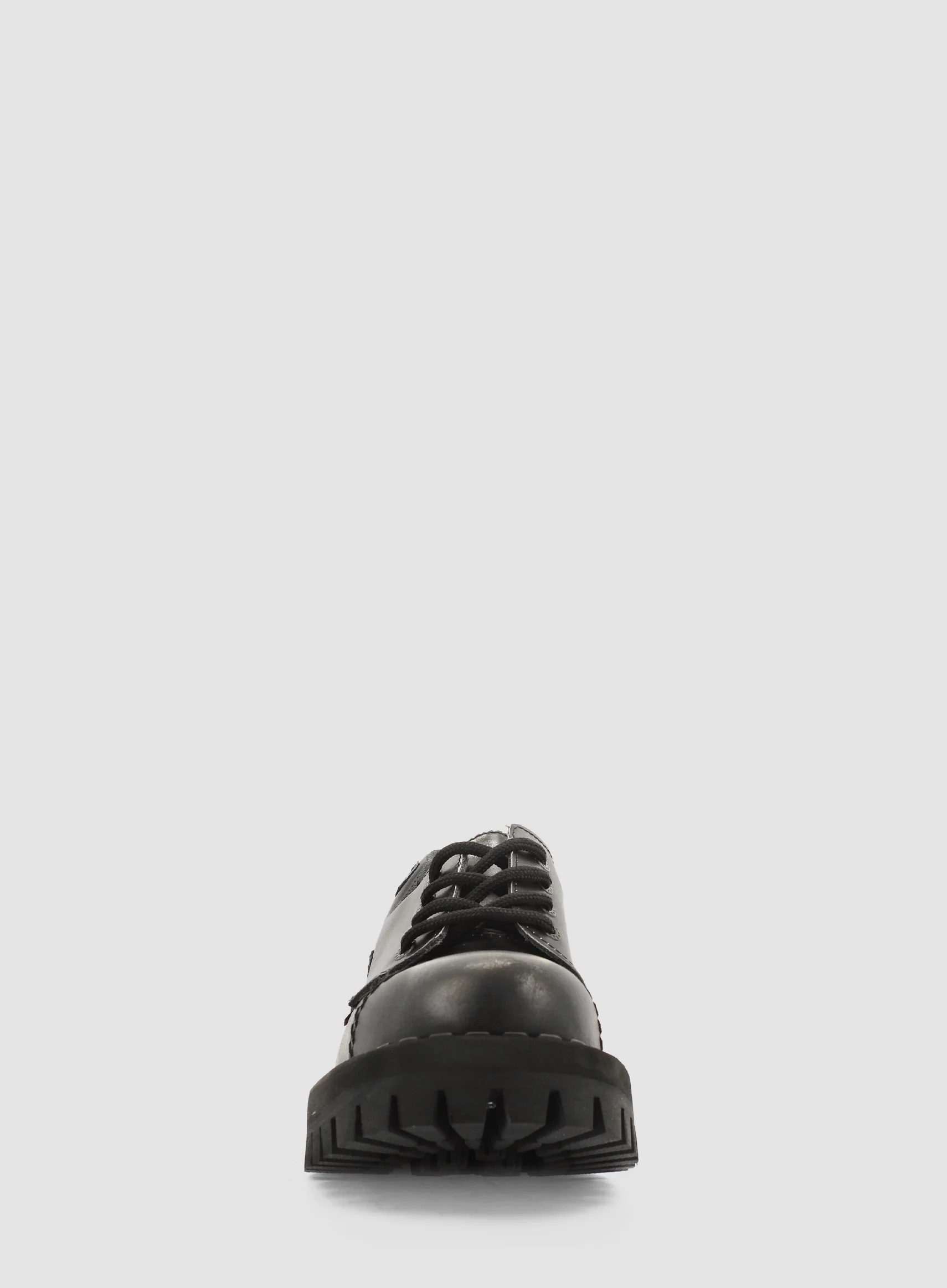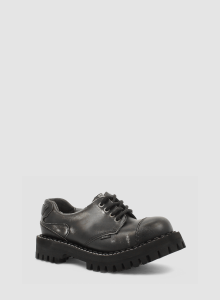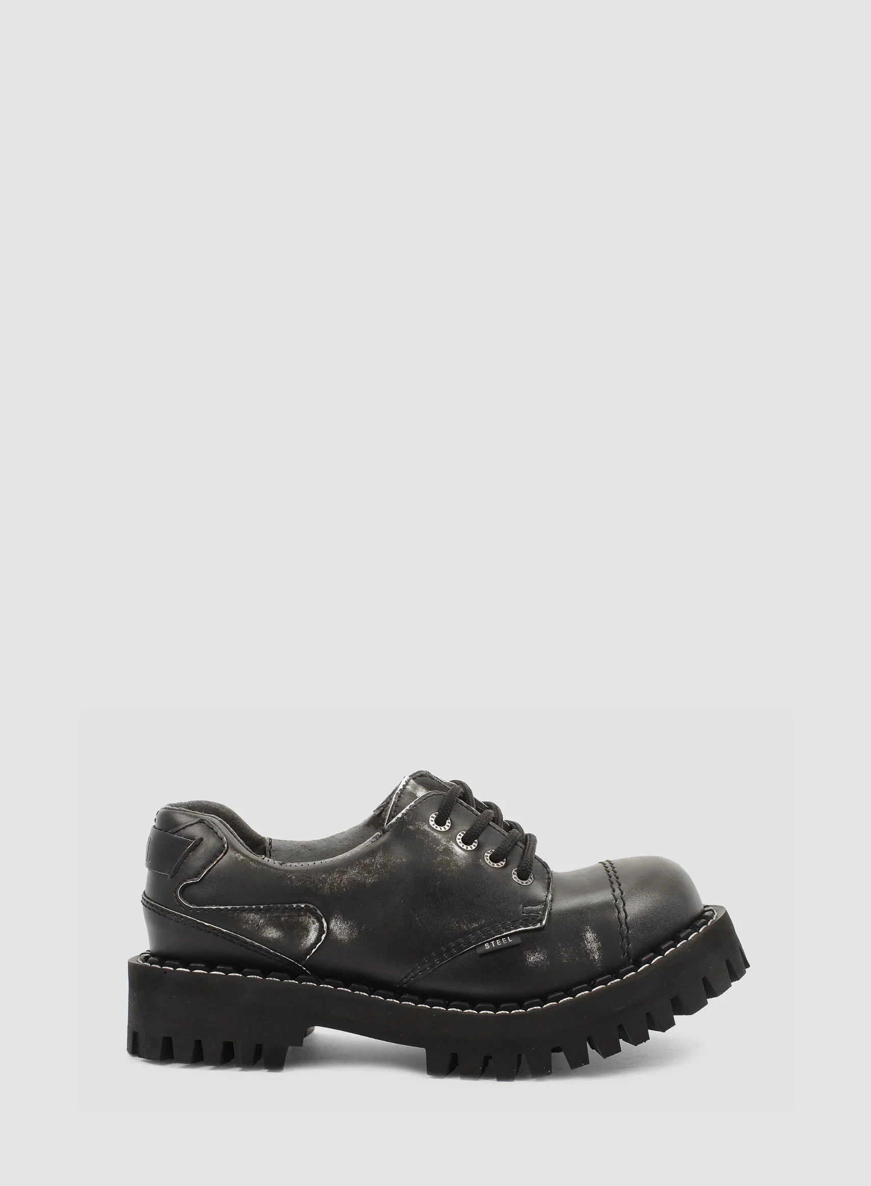 Model znanej europejskiej marki STEEL. Prezentowany model buta to klasyczny GLAN 4-dziurowy w kolorze BIAŁYM PRZECIERANYM NA CZARNO (white/black). Charakteryzujący się przeszytym przodem i tylnikiem z logo marki STEEL. Wykonany ze skóry naturalnej z metalowym noskiem oraz czarną PODWYŻSZANĄ gumową podeszwą z wkrętami typu MONSTER o wysokości 4,5 cm.