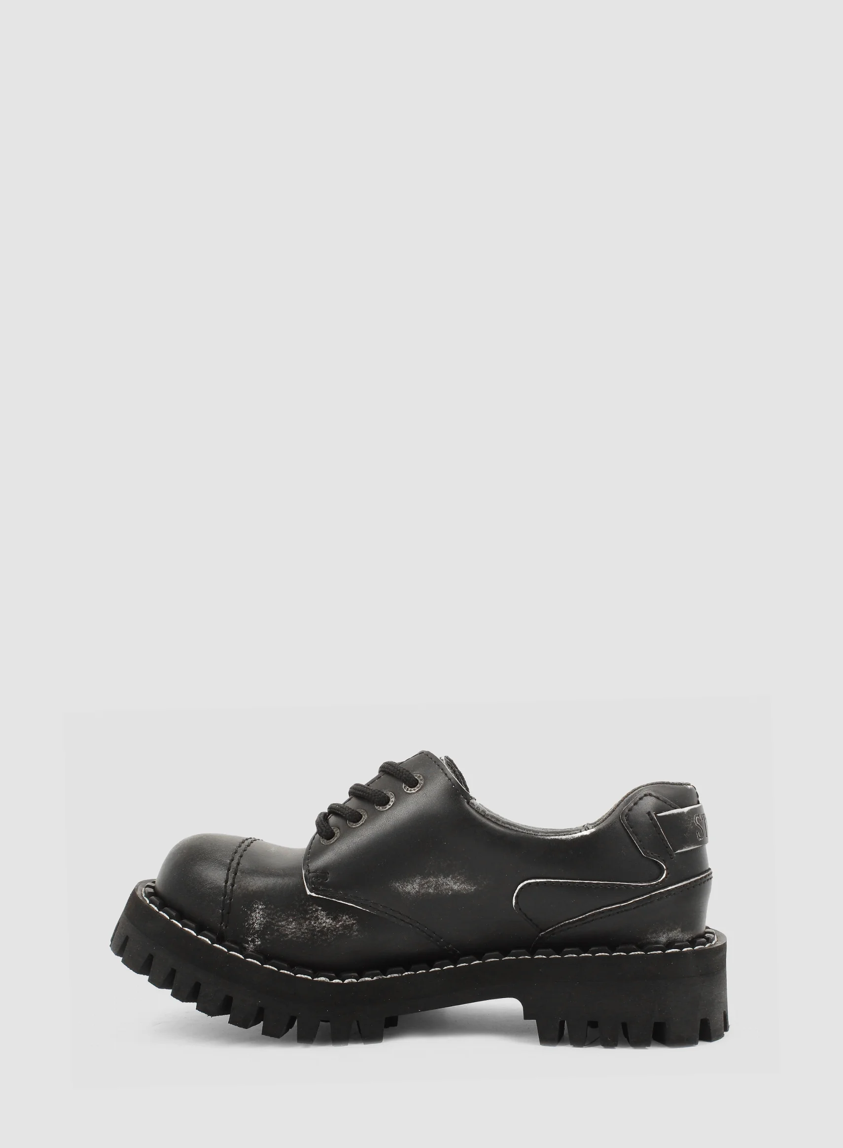 Model znanej europejskiej marki STEEL. Prezentowany model buta to klasyczny GLAN 4-dziurowy w kolorze BIAŁYM PRZECIERANYM NA CZARNO (white/black). Charakteryzujący się przeszytym przodem i tylnikiem z logo marki STEEL. Wykonany ze skóry naturalnej z metalowym noskiem oraz czarną PODWYŻSZANĄ gumową podeszwą z wkrętami typu MONSTER o wysokości 4,5 cm.