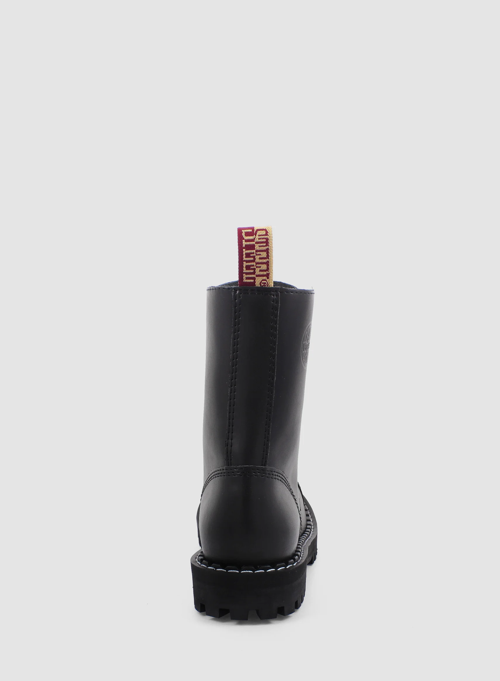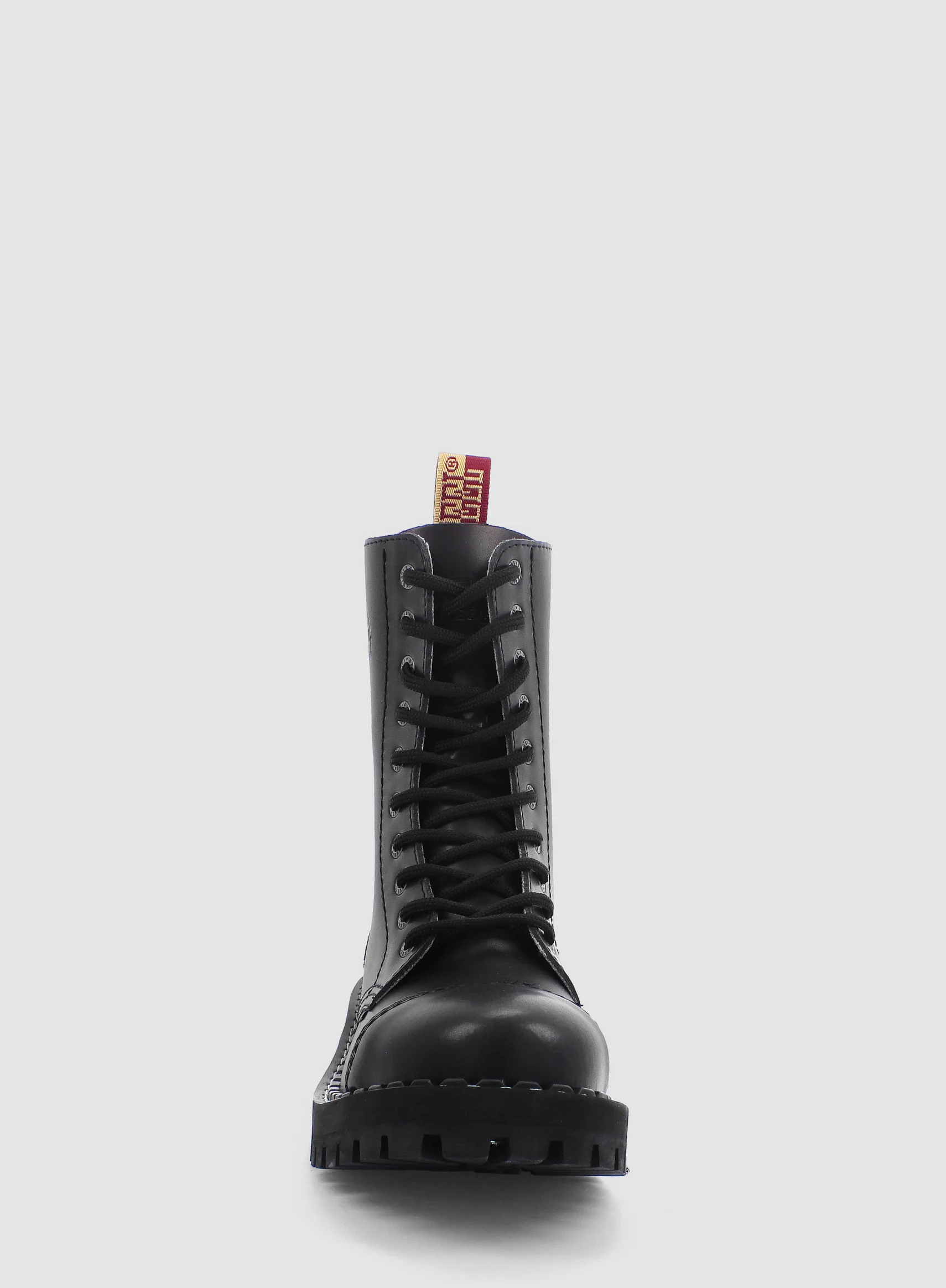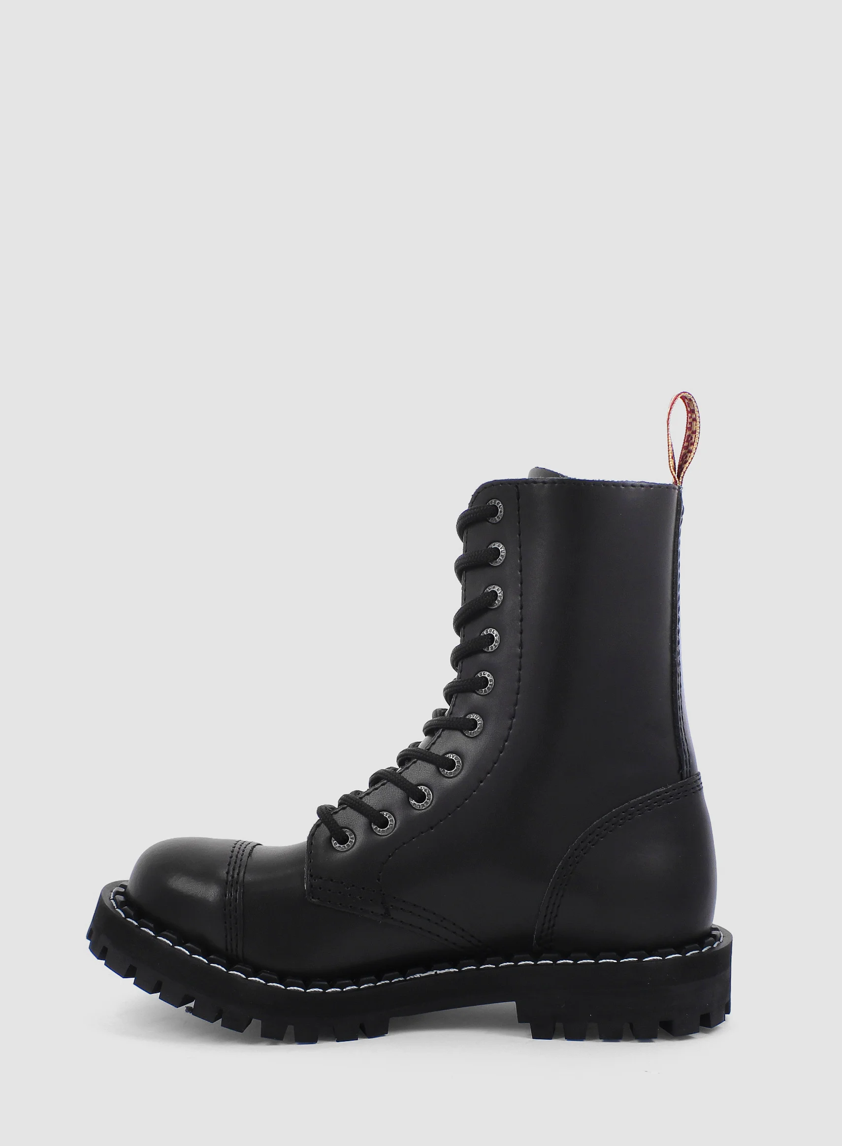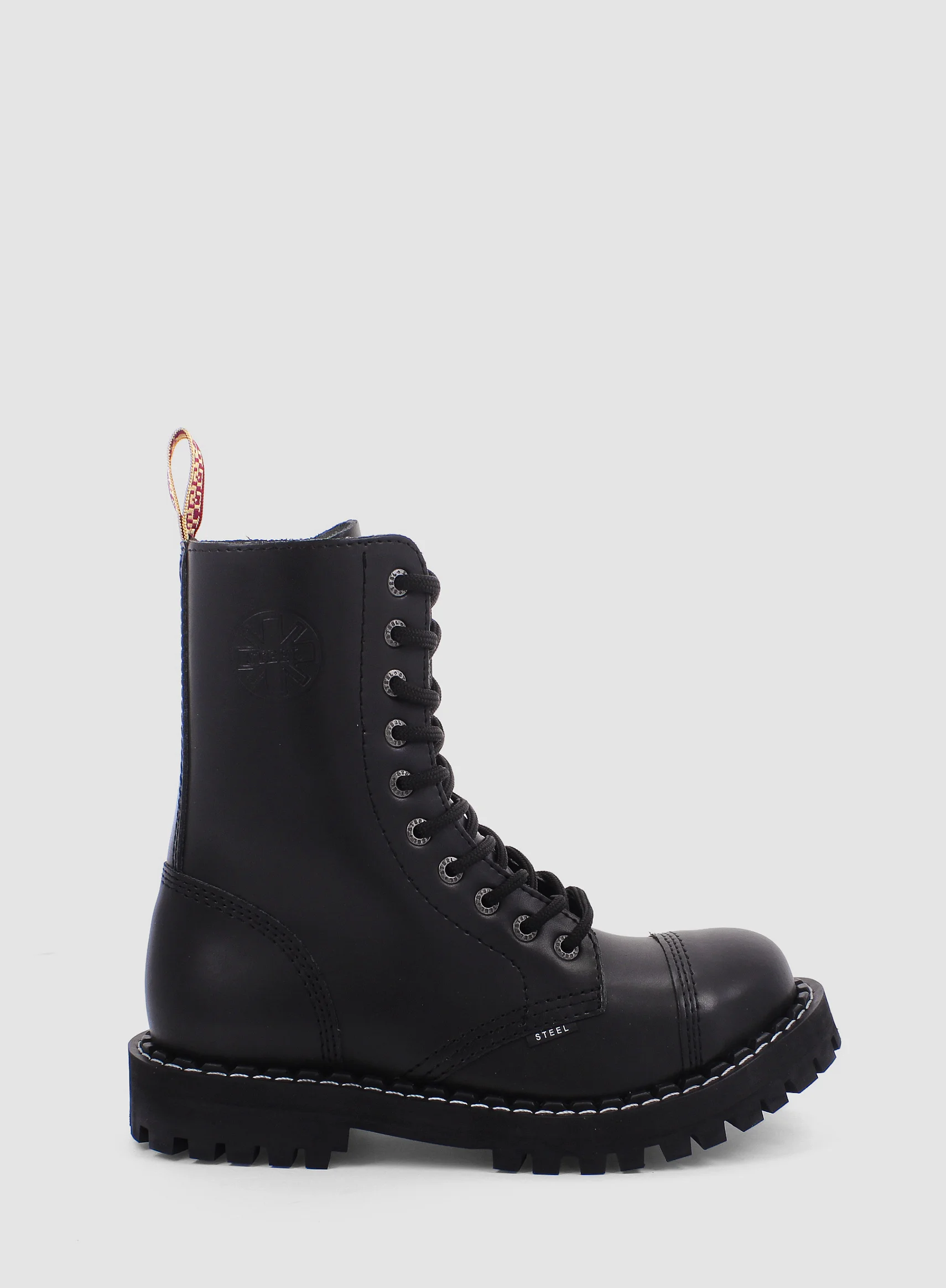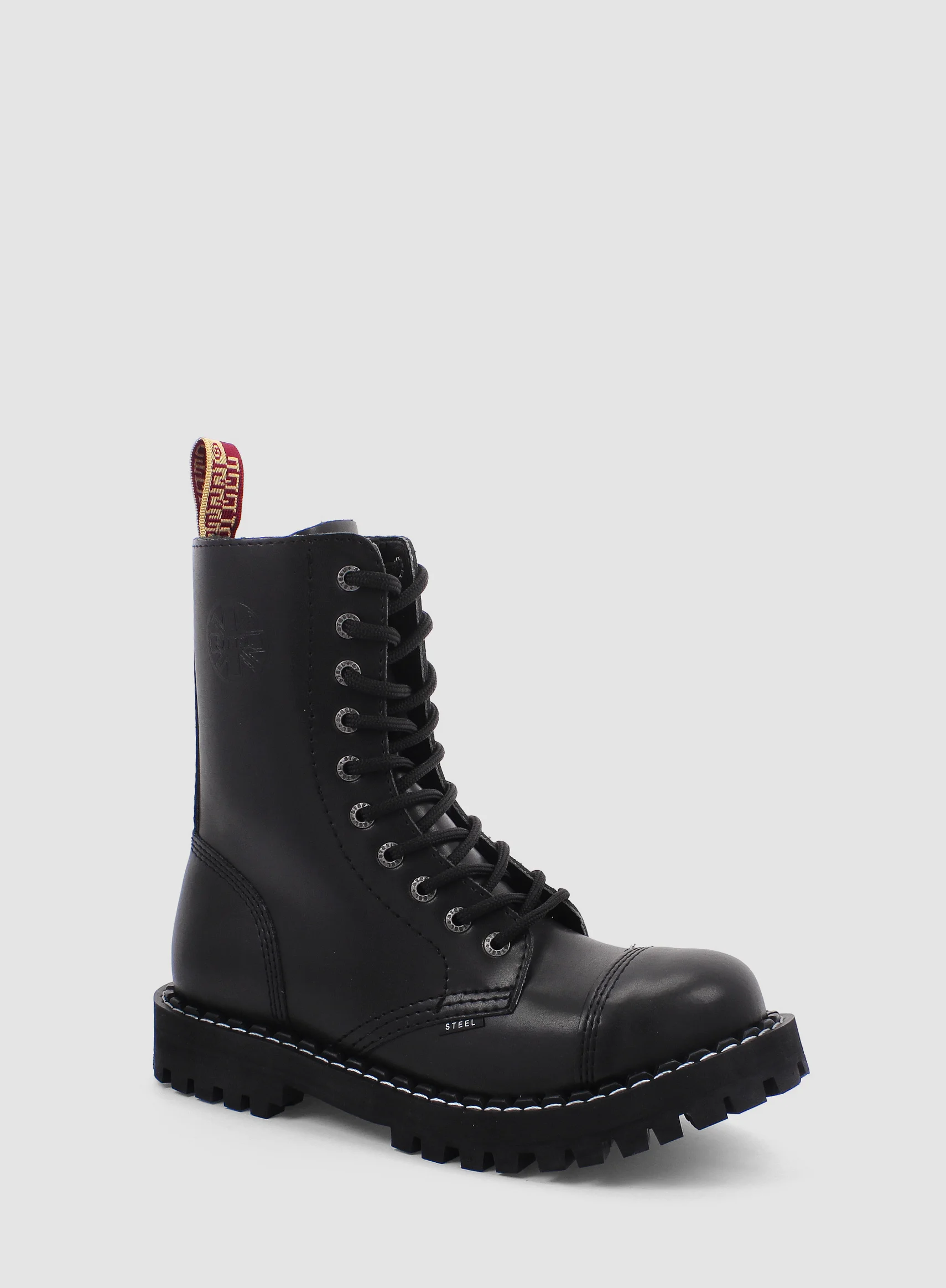 Model znanej europejskiej marki STEEL. Prezentowany model buta to klasyczny GLAN 10-dziurowy w kolorze CZARNYM (black). Jest to bestseller wśród glanów. Wykonany ze skóry naturalnej z metalowym noskiem oraz czarną gumową podeszwą z wkrętami.