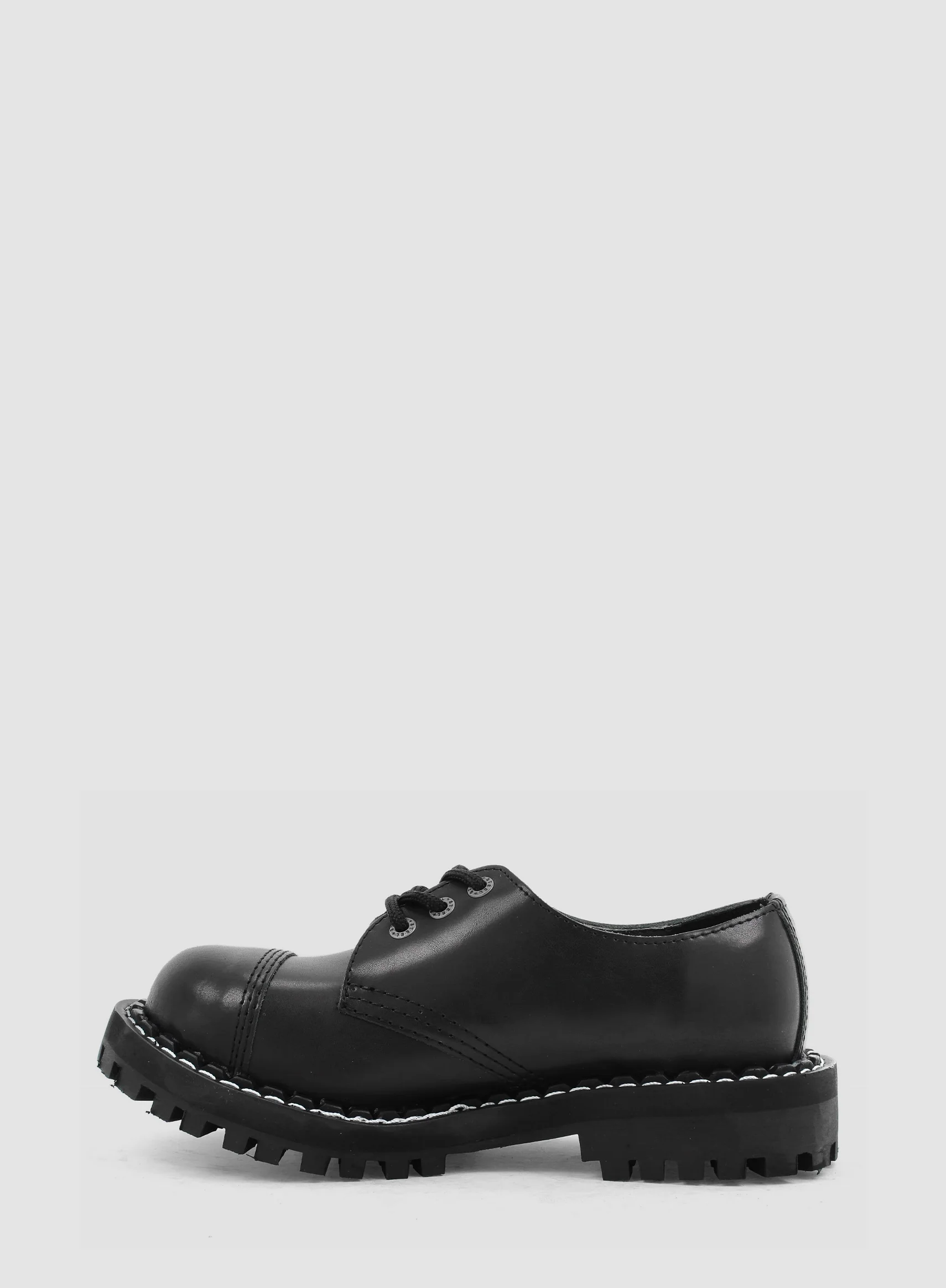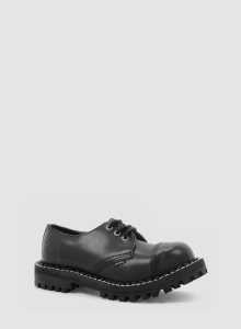 Model znanej europejskiej marki STEEL. Prezentowany model buta to klasyczny GLAN 3-dziurowy w kolorze CZARNYM (black). Jest to bestseller wśród glanów. Wykonany ze skóry naturalnej z metalowym noskiem oraz czarną gumową podeszwą z wkrętami.