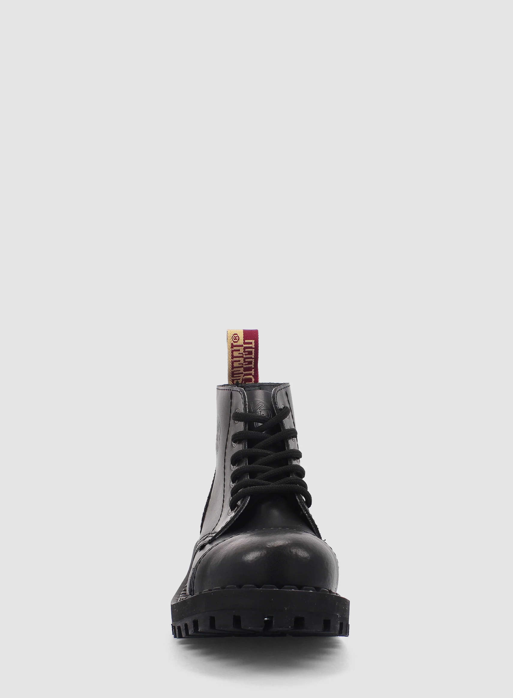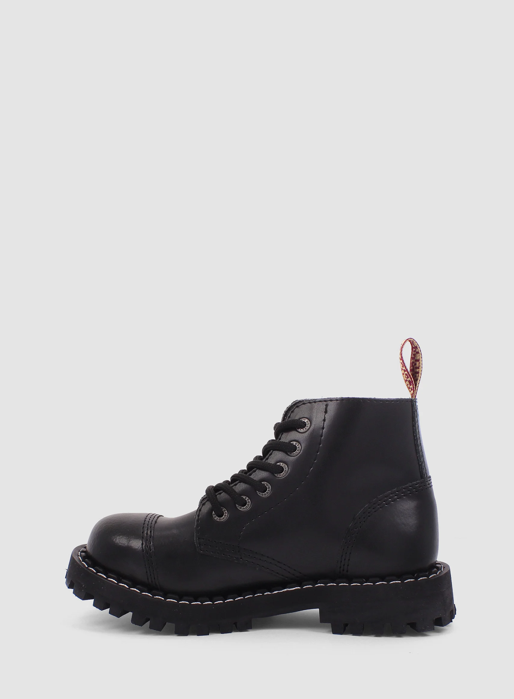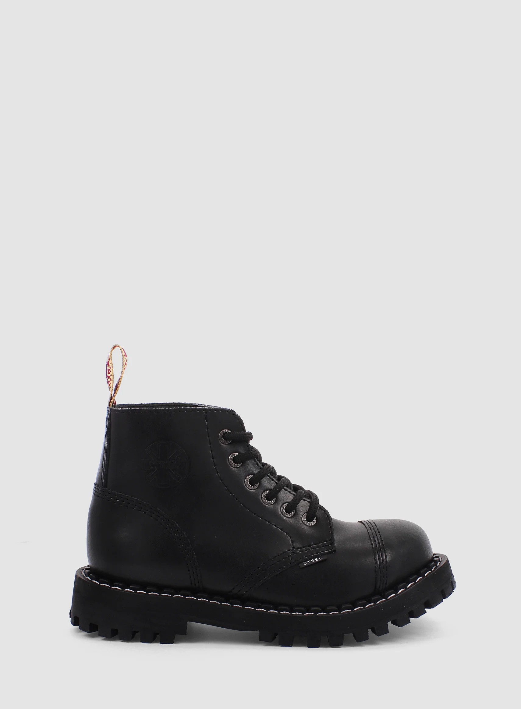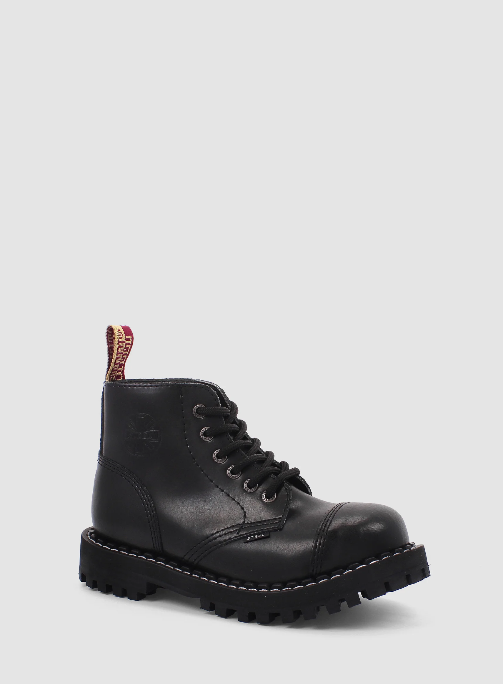 Model znanej europejskiej marki STEEL. Prezentowany model buta to klasyczny GLAN 6-dziurowy w kolorze CZARNYM (black). Jest to bestseller wśród glanów. Wykonany ze skóry naturalnej z metalowym noskiem oraz czarną gumową podeszwą z wkrętami.