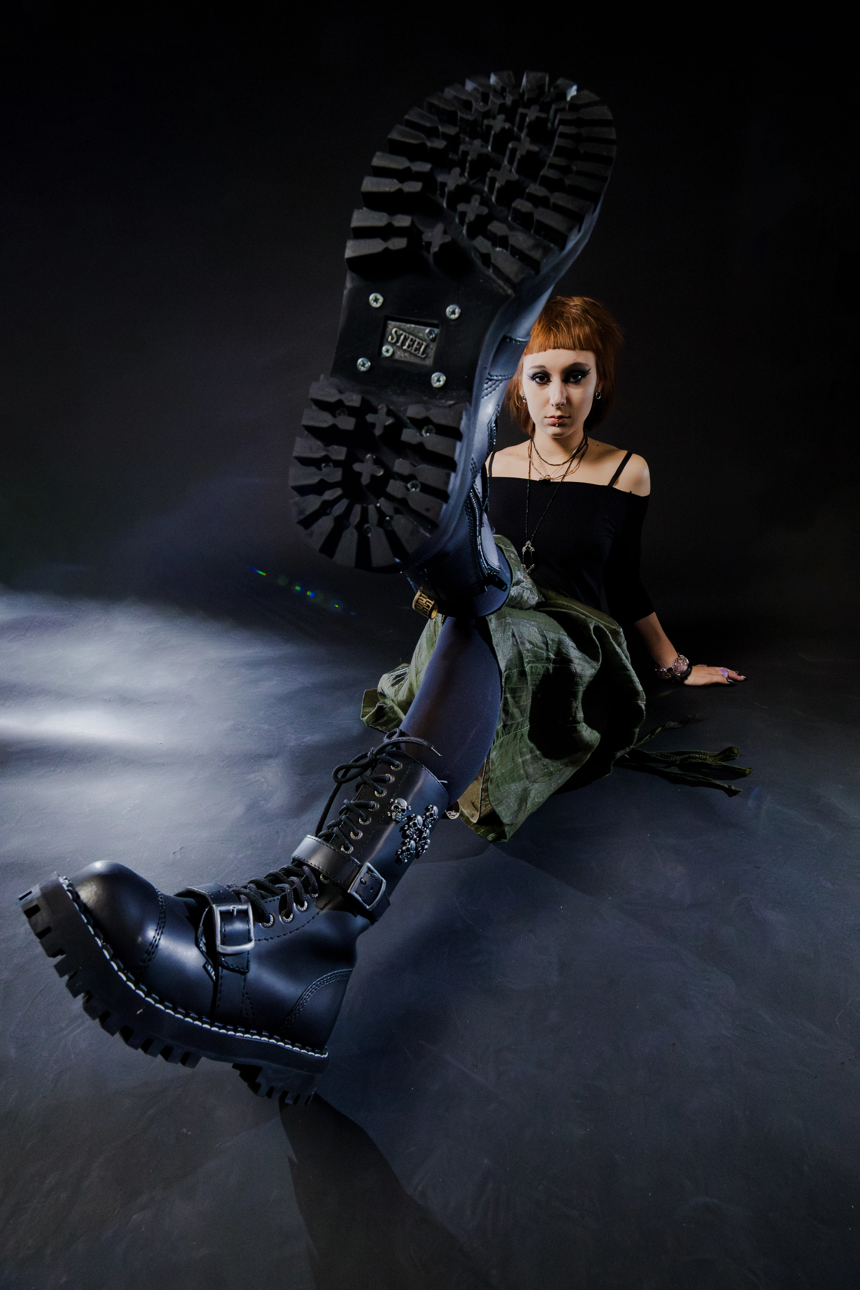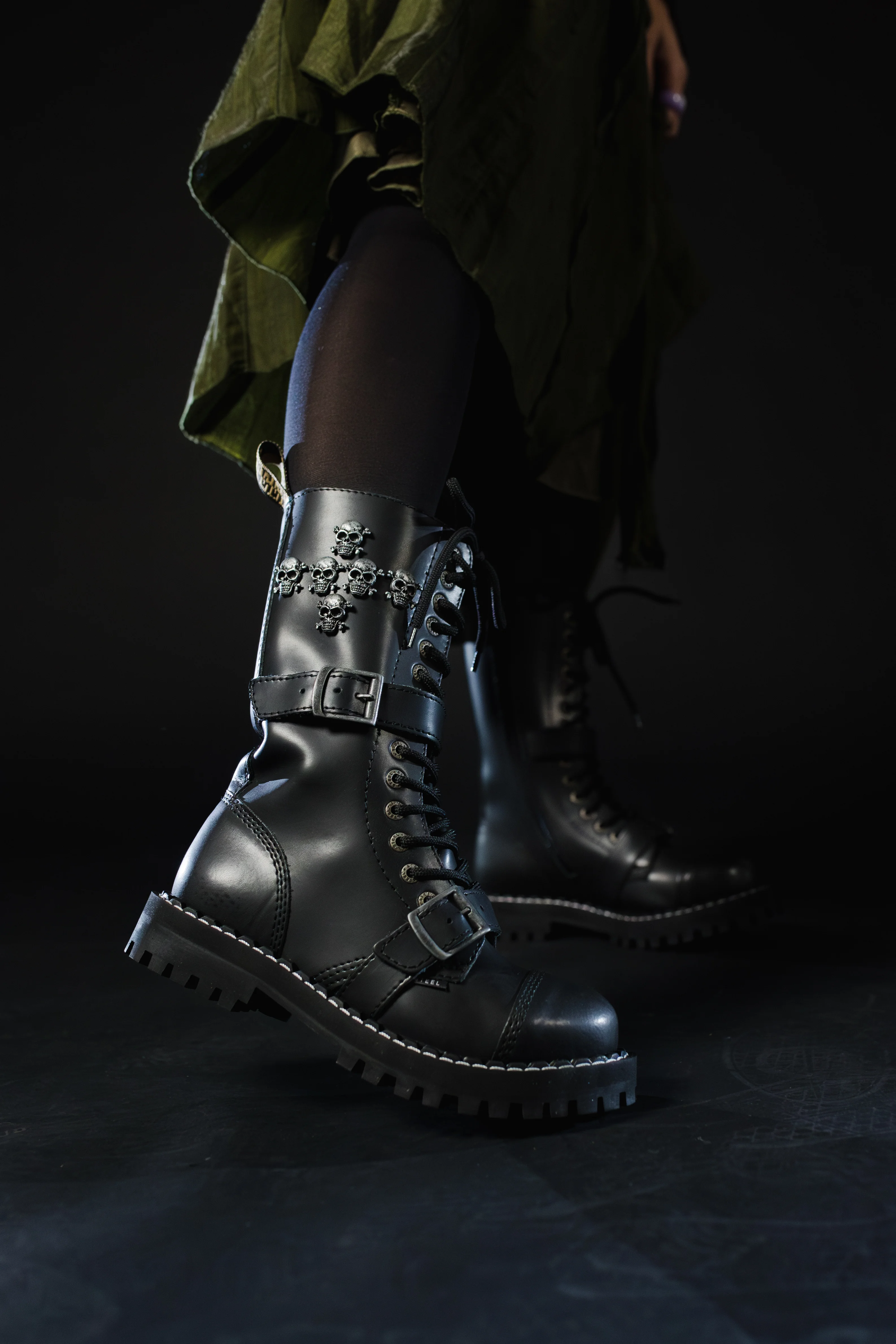 Model znanej europejskiej marki STEEL. Prezentowany model buta to klasyczny GLAN 15-dziurowy w kolorze CZARNYM (black). Wykonany ze skóry naturalnej z metalowym noskiem oraz czarną gumową podeszwą z wkrętami. Model dodatkowo posiada zamek po wewnętrznej stronie buta, 6 metalowych czaszek i dwa paski z klamrą.