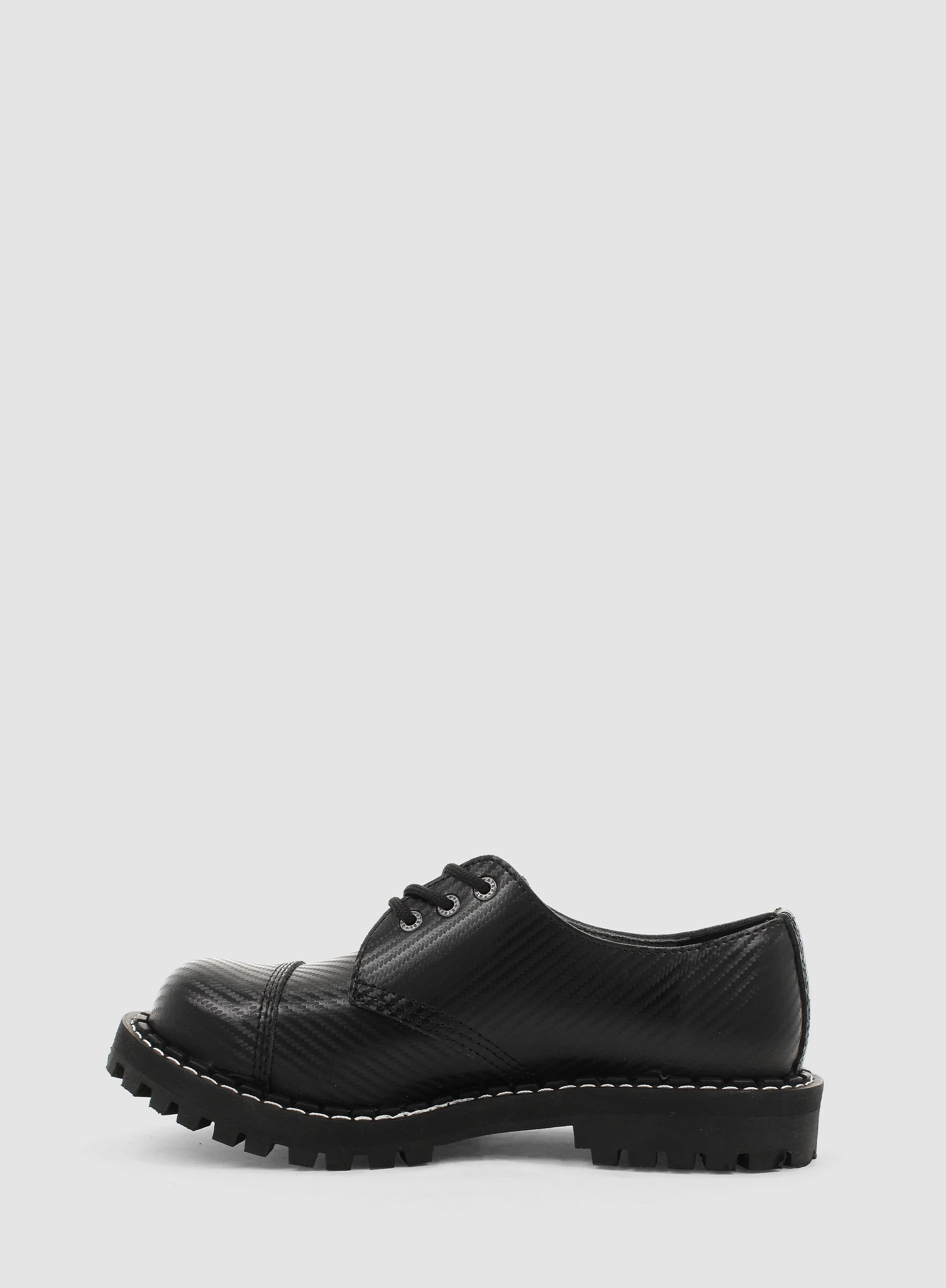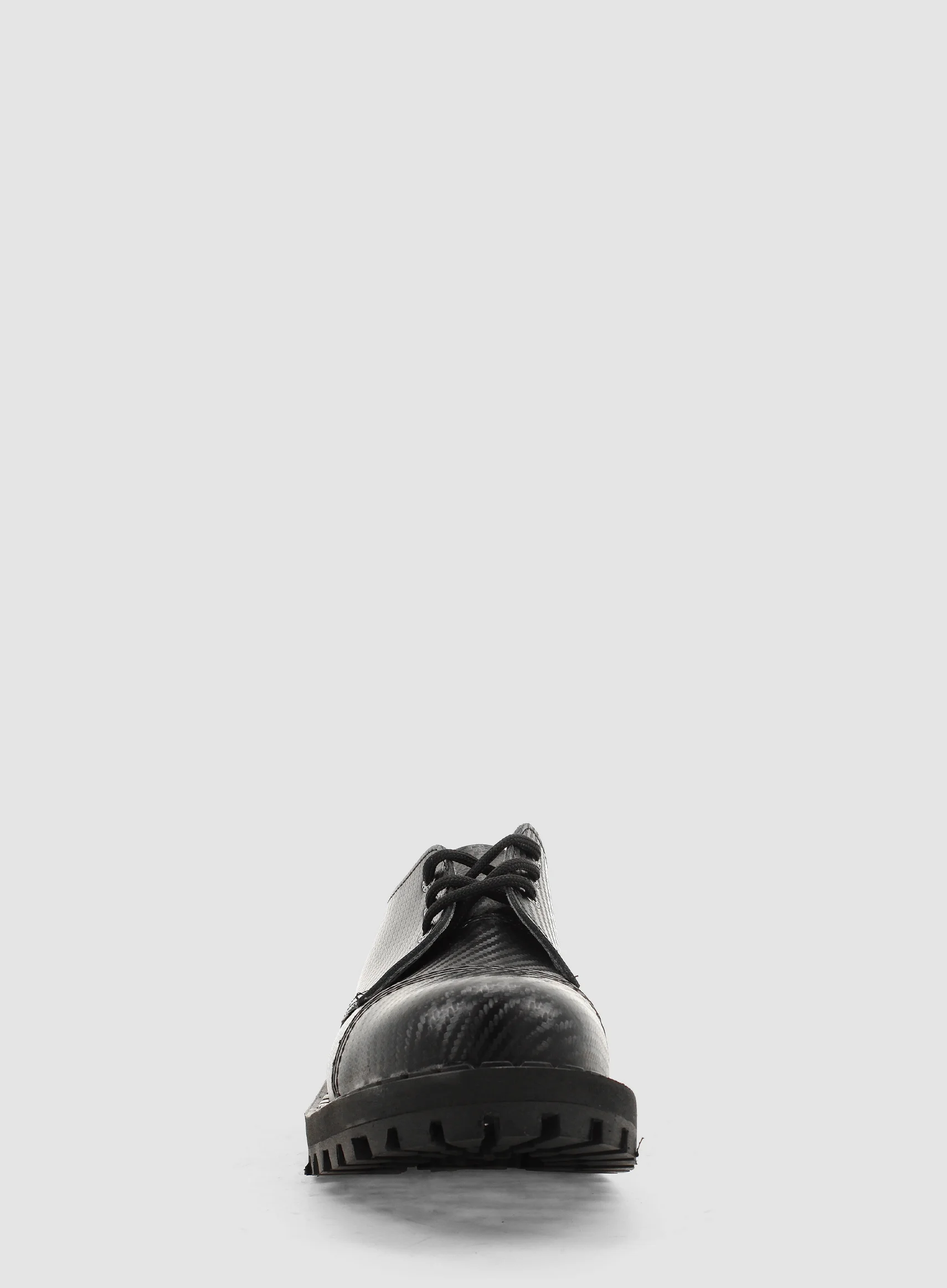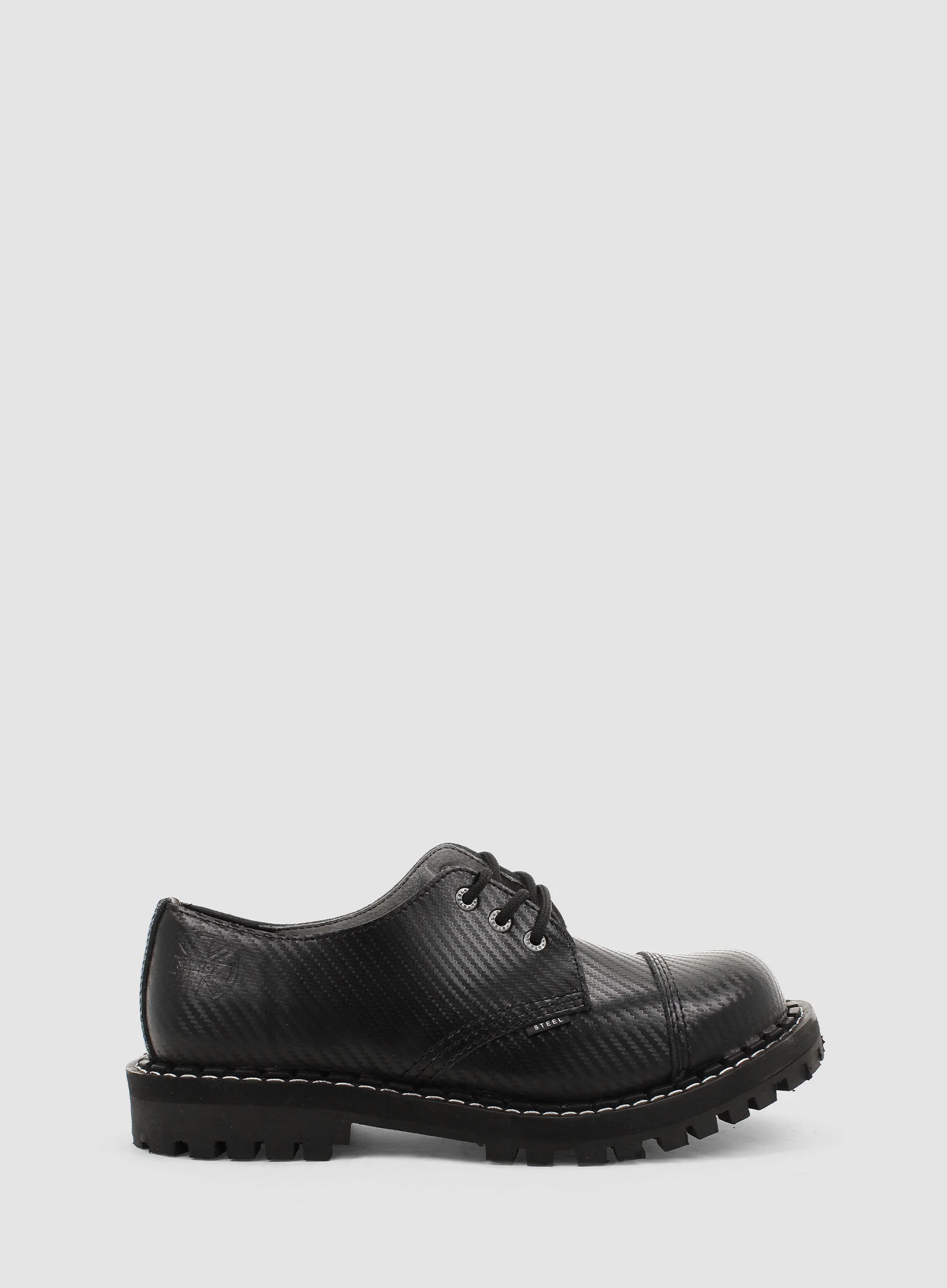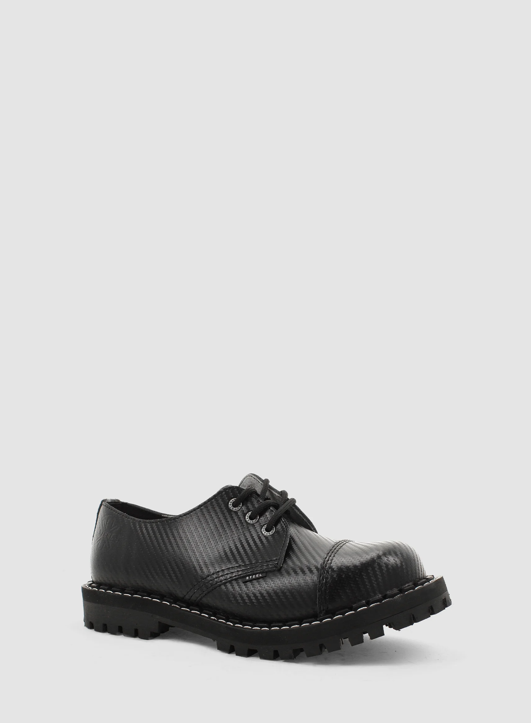 Model znanej europejskiej marki STEEL. Prezentowany model buta to klasyczny GLAN 3-dziurowy w kolorze CZARNYM PRĄŻKOWANYM (black D-195). Wykonany ze skóry naturalnej z metalowym noskiem oraz czarną gumową podeszwą z wkrętami.