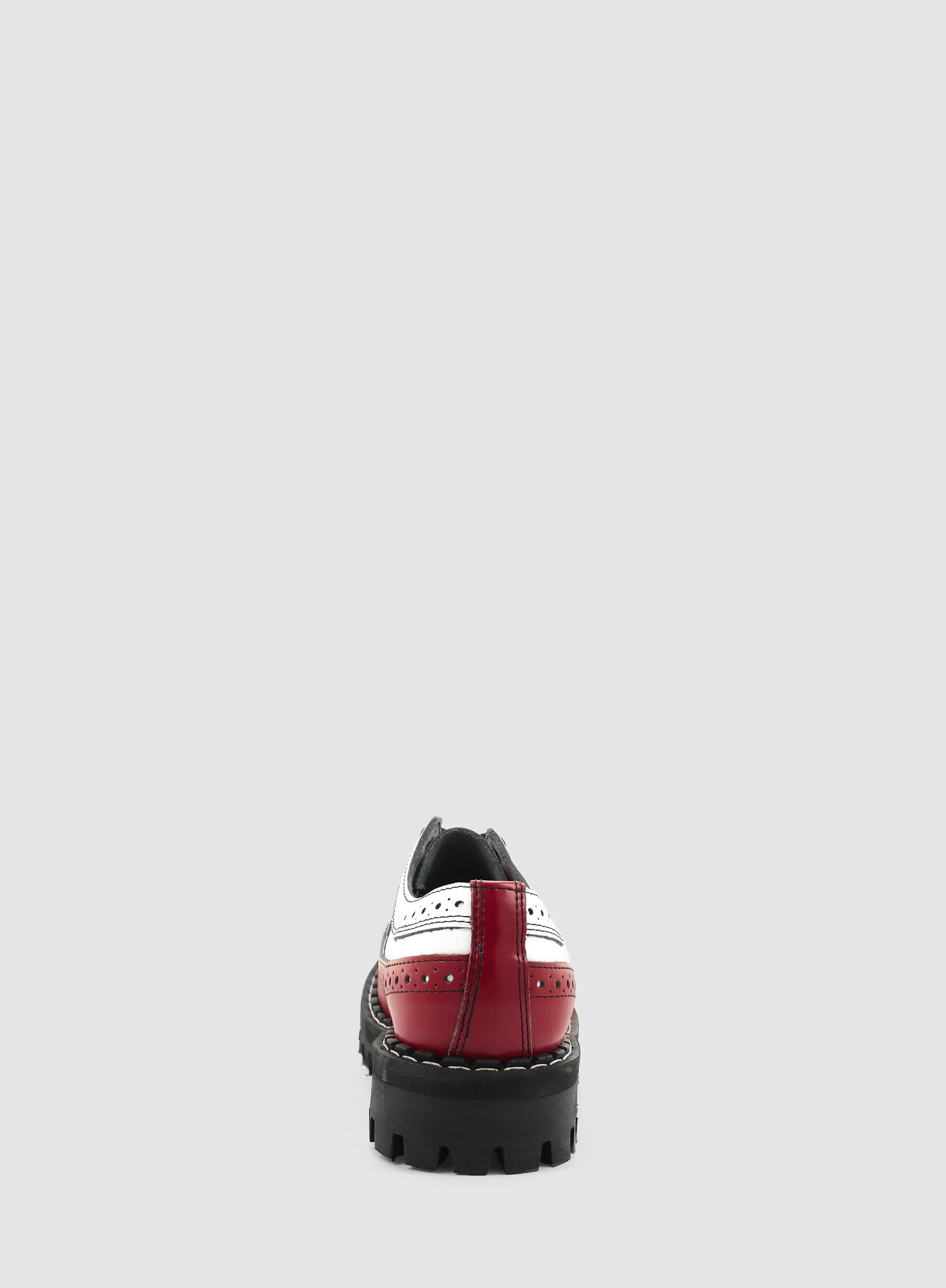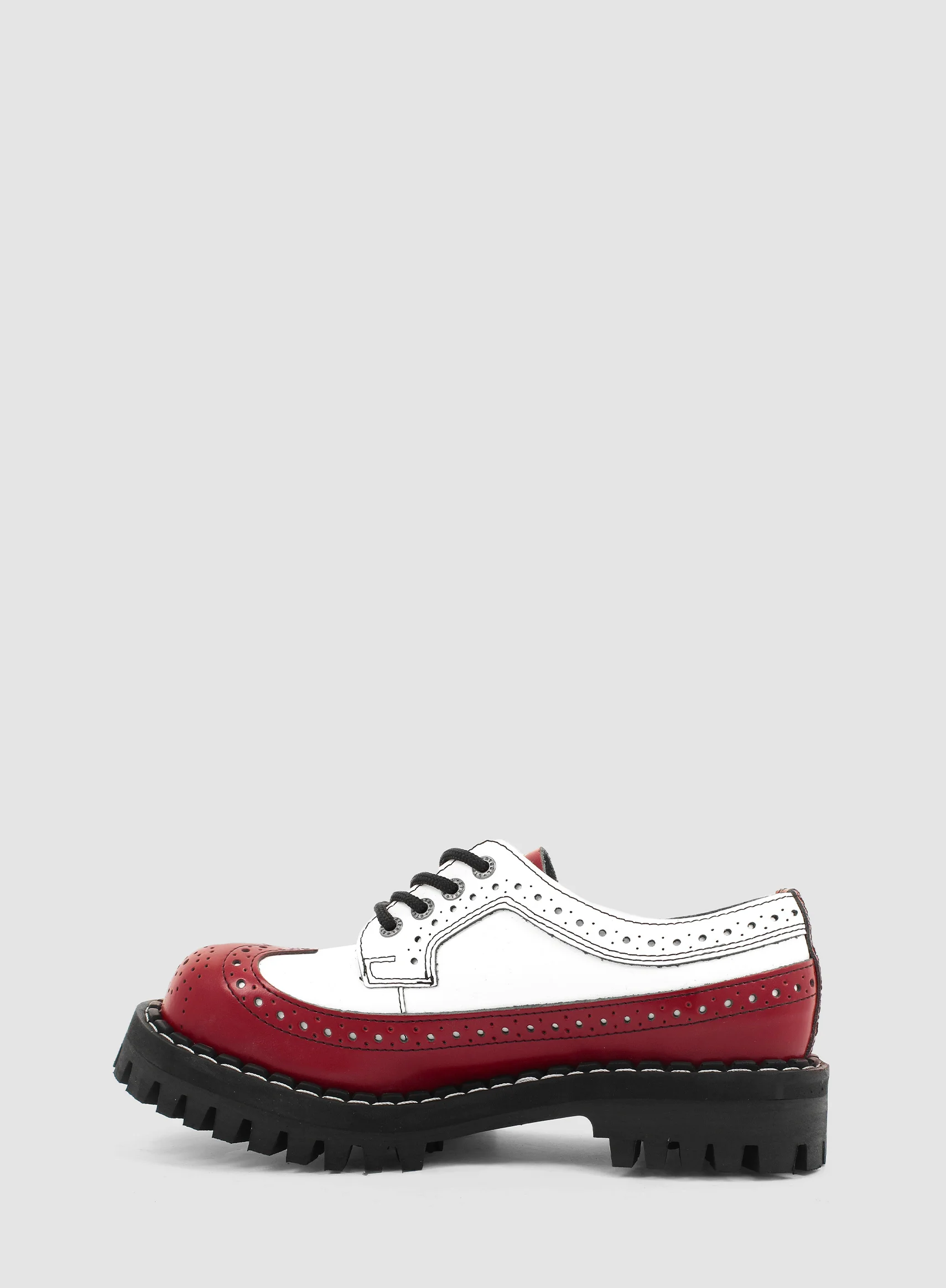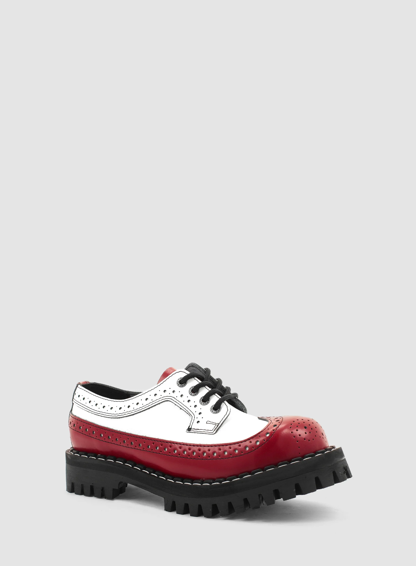 Model znanej europejskiej marki STEEL. Prezentowany model buta to klasyczny GLAN ALCAPONE 4-dziurowy w kolorze CZERWONYM I BIAŁYM (red+white). Jest to bestseller wśród glanów. Wykonany ze skóry naturalnej z metalowym noskiem oraz czarną PODWYŻSZANĄ gumową podeszwą z wkrętami typu MONSTER o wysokości 4,5 cm.