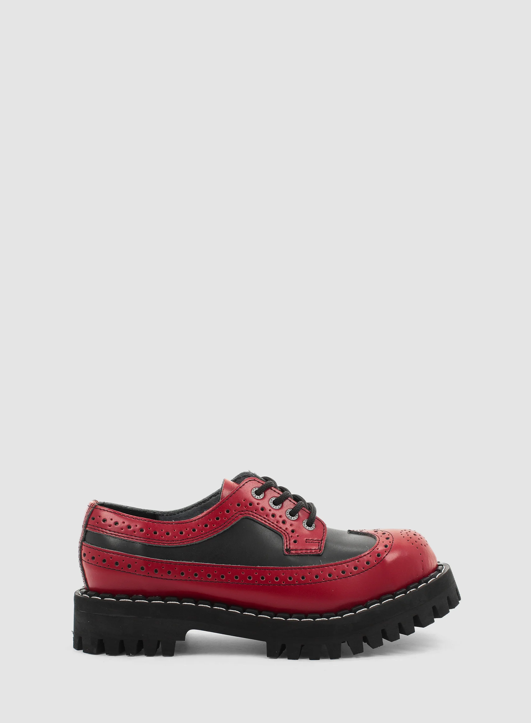 Model znanej europejskiej marki STEEL. Prezentowany model buta to klasyczny GLAN ALCAPONE 4-dziurowy w kolorze CZERWONYM I CZARNYM (red+black). Jest to bestseller wśród glanów. Wykonany ze skóry naturalnej z metalowym noskiem oraz czarną PODWYŻSZANĄ gumową podeszwą z wkrętami typu MONSTER o wysokości 4,5 cm.