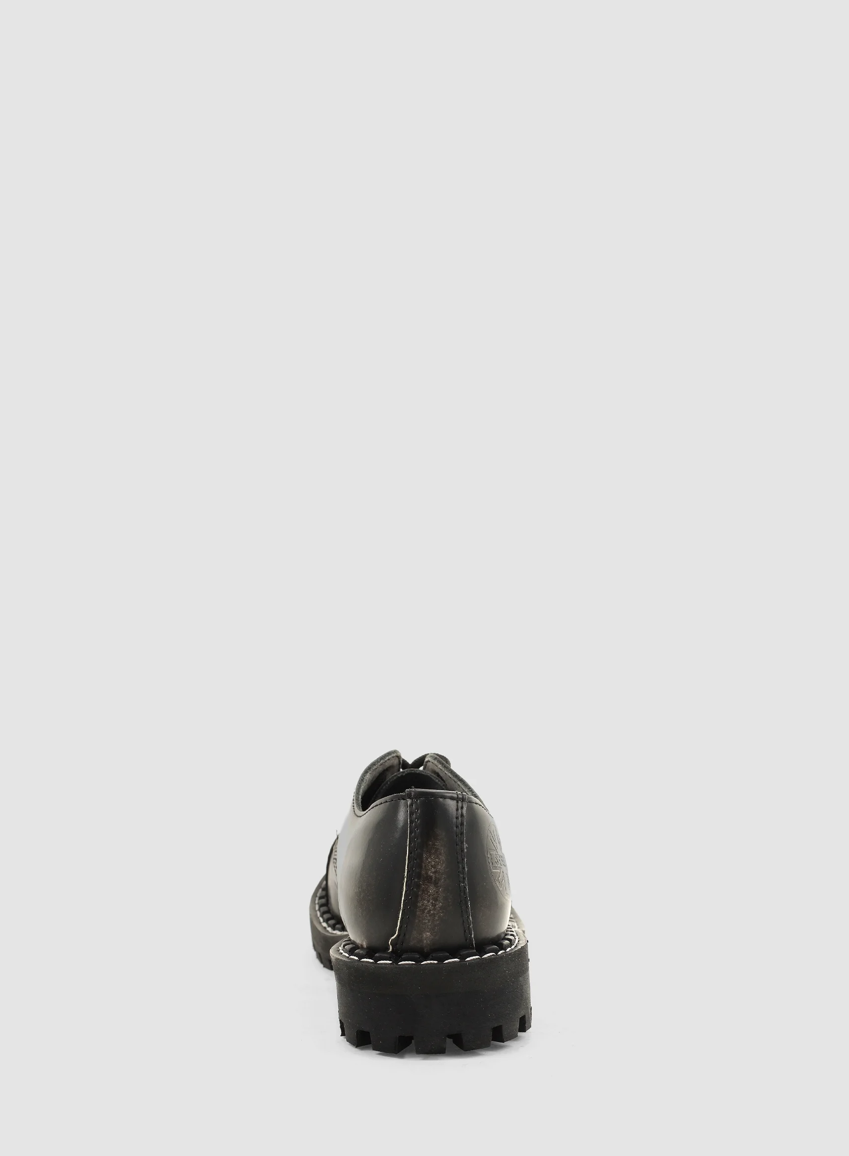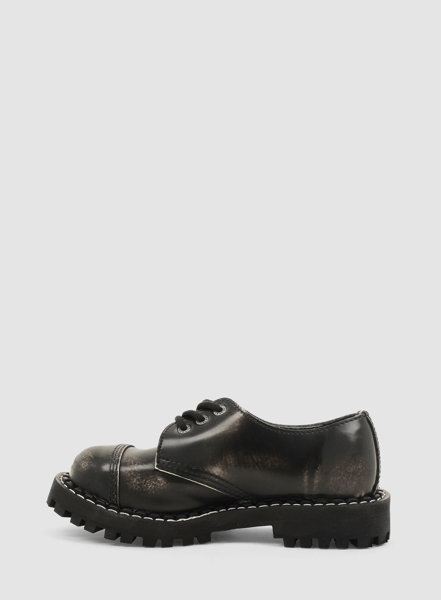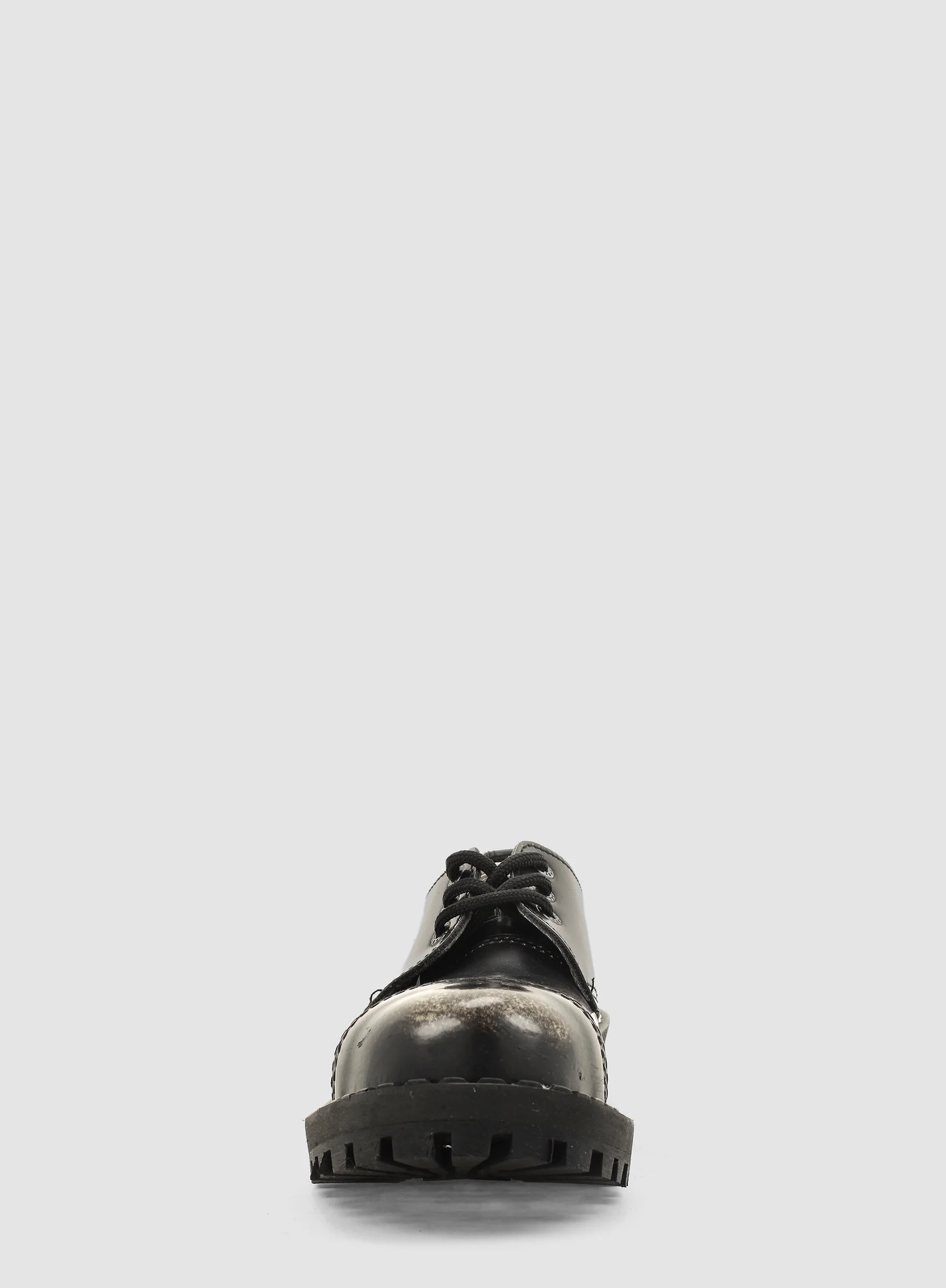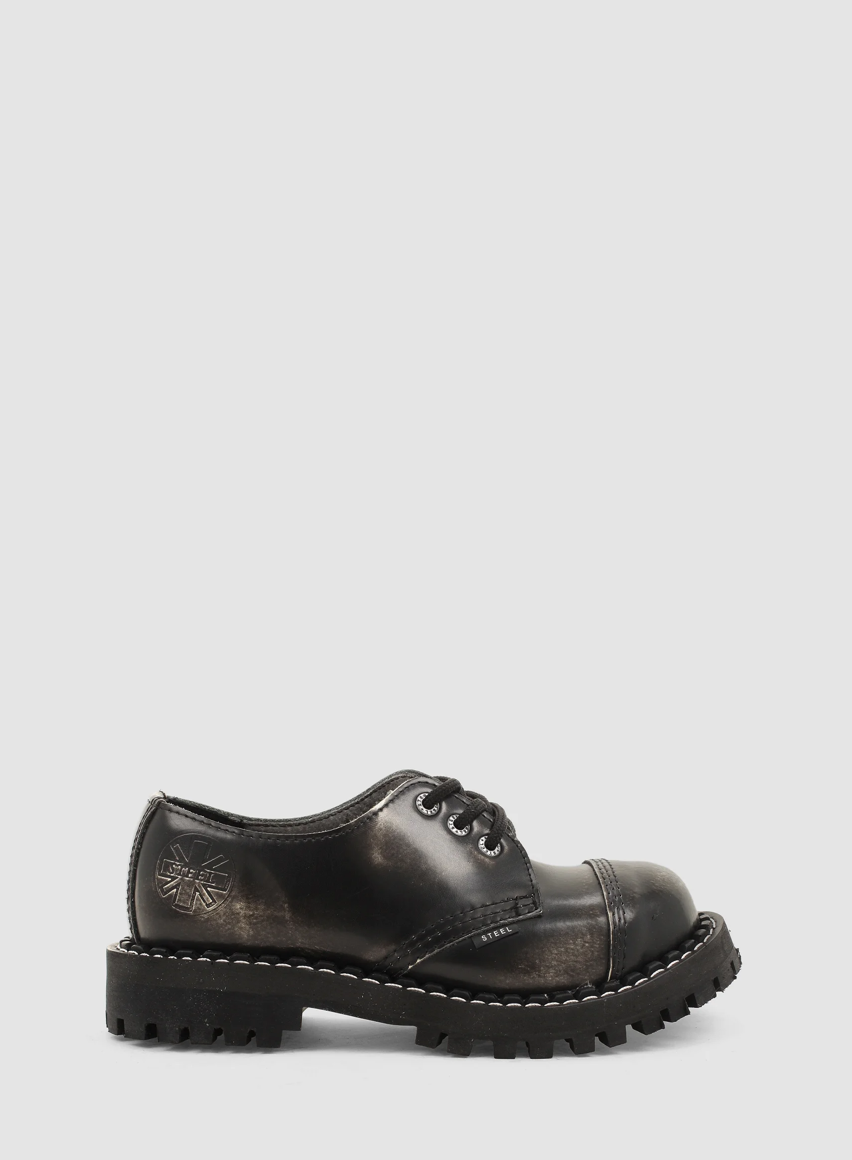 Model znanej europejskiej marki STEEL. Prezentowany model buta to klasyczny GLAN 3-dziurowy w kolorze ECRU PRZECIERANYM NA CZARNO (ecru/black). Wykonany ze skóry naturalnej z metalowym noskiem oraz czarną gumową podeszwą z wkrętami.