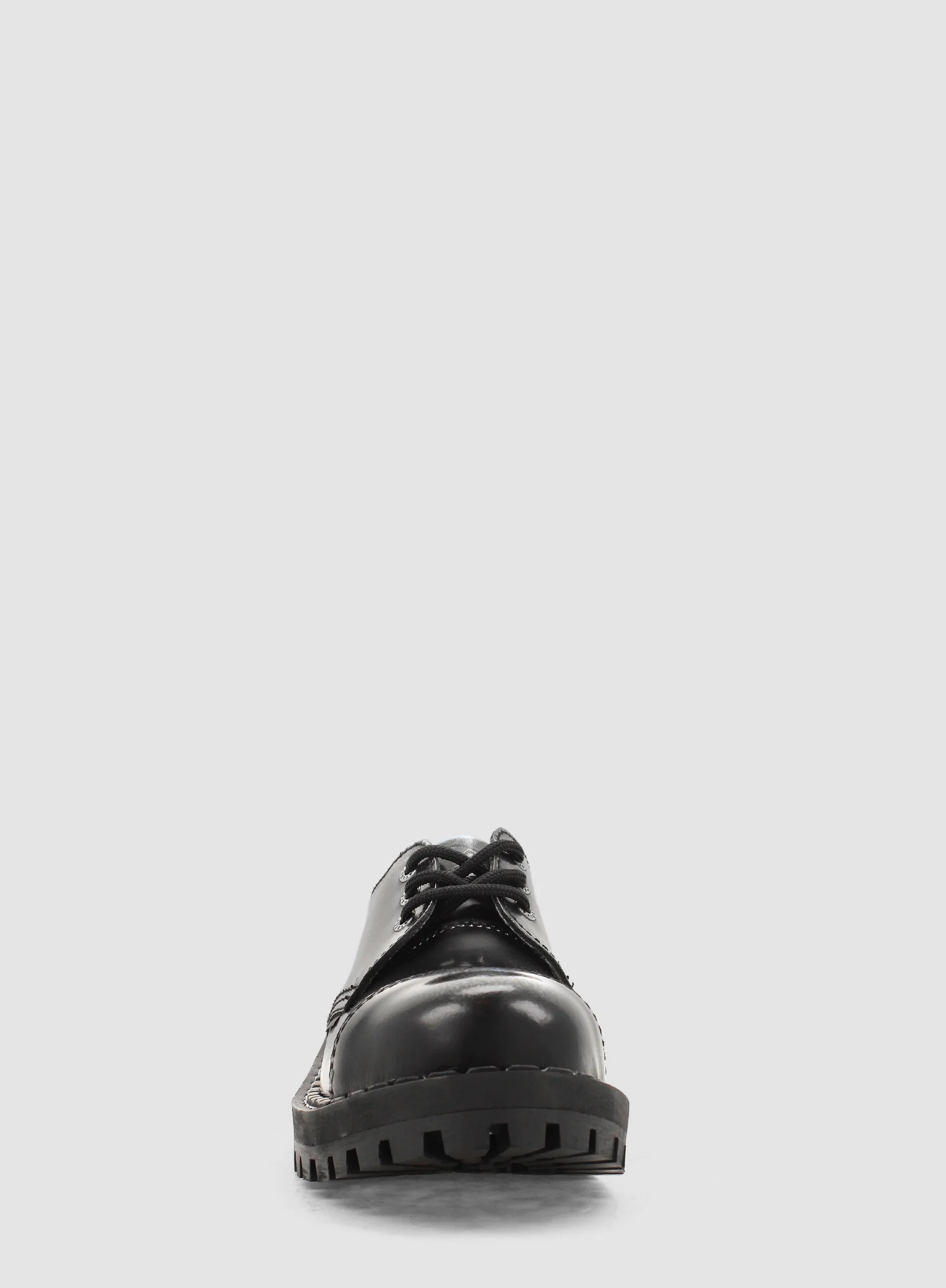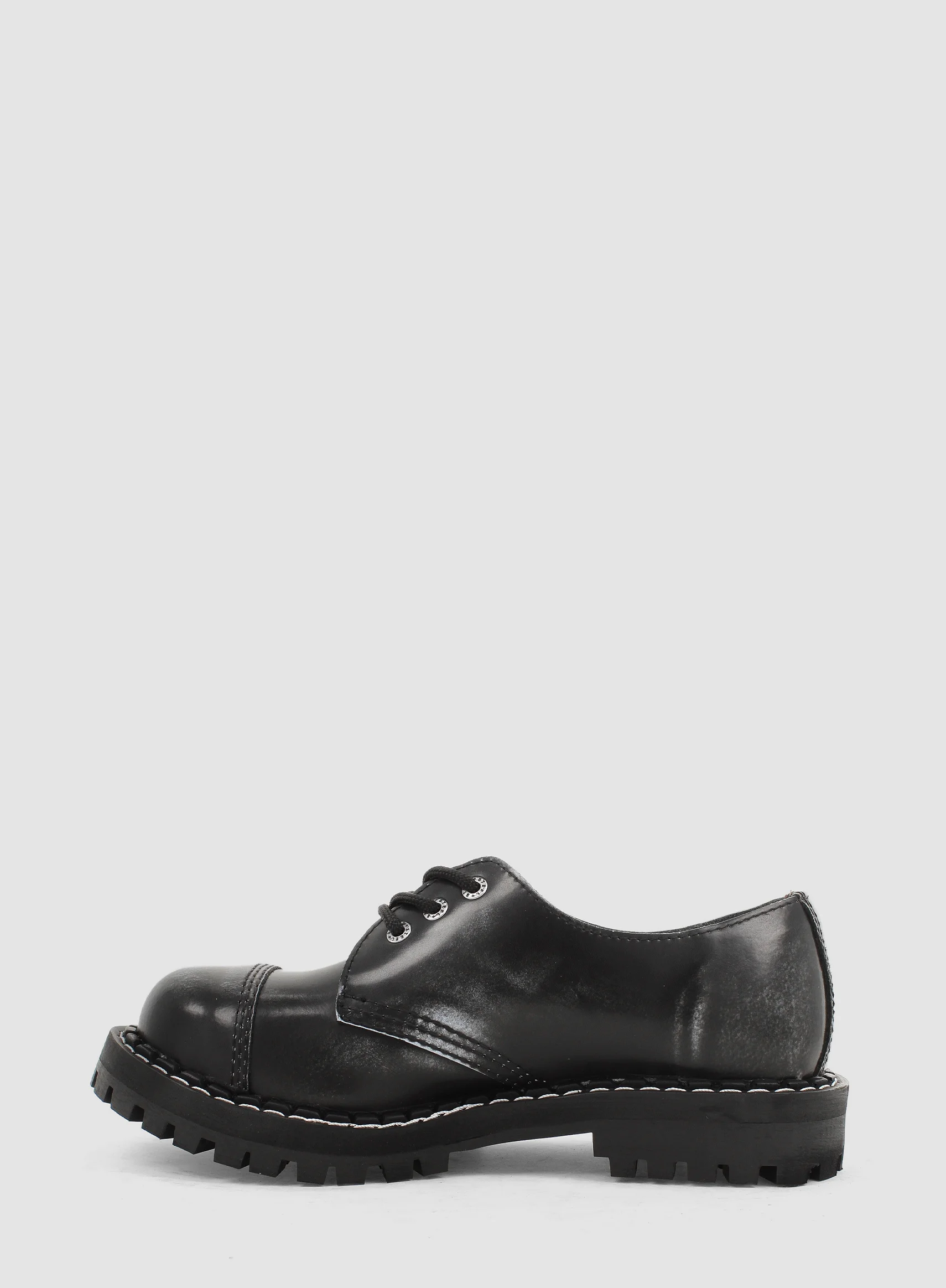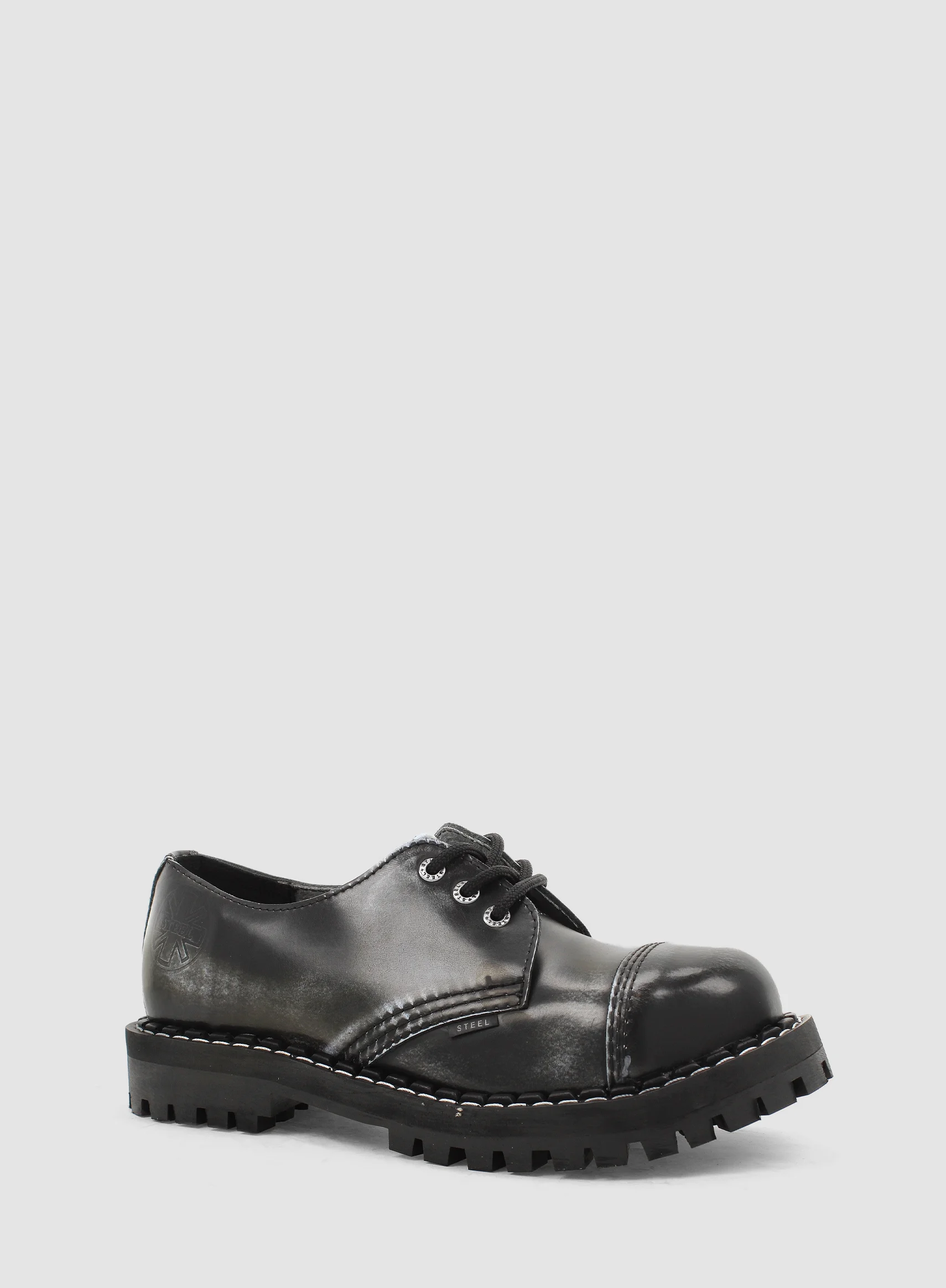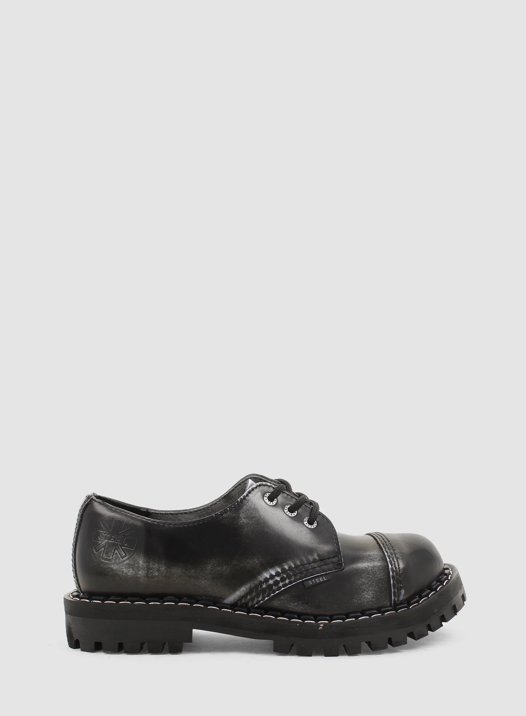 Model znanej europejskiej marki STEEL. Prezentowany model buta to klasyczny GLAN 3-dziurowy w kolorze JEANS PRZECIERANY NA CZARNO (jeans/black). Wykonany ze skóry naturalnej z metalowym noskiem oraz czarną gumową podeszwą z wkrętami.