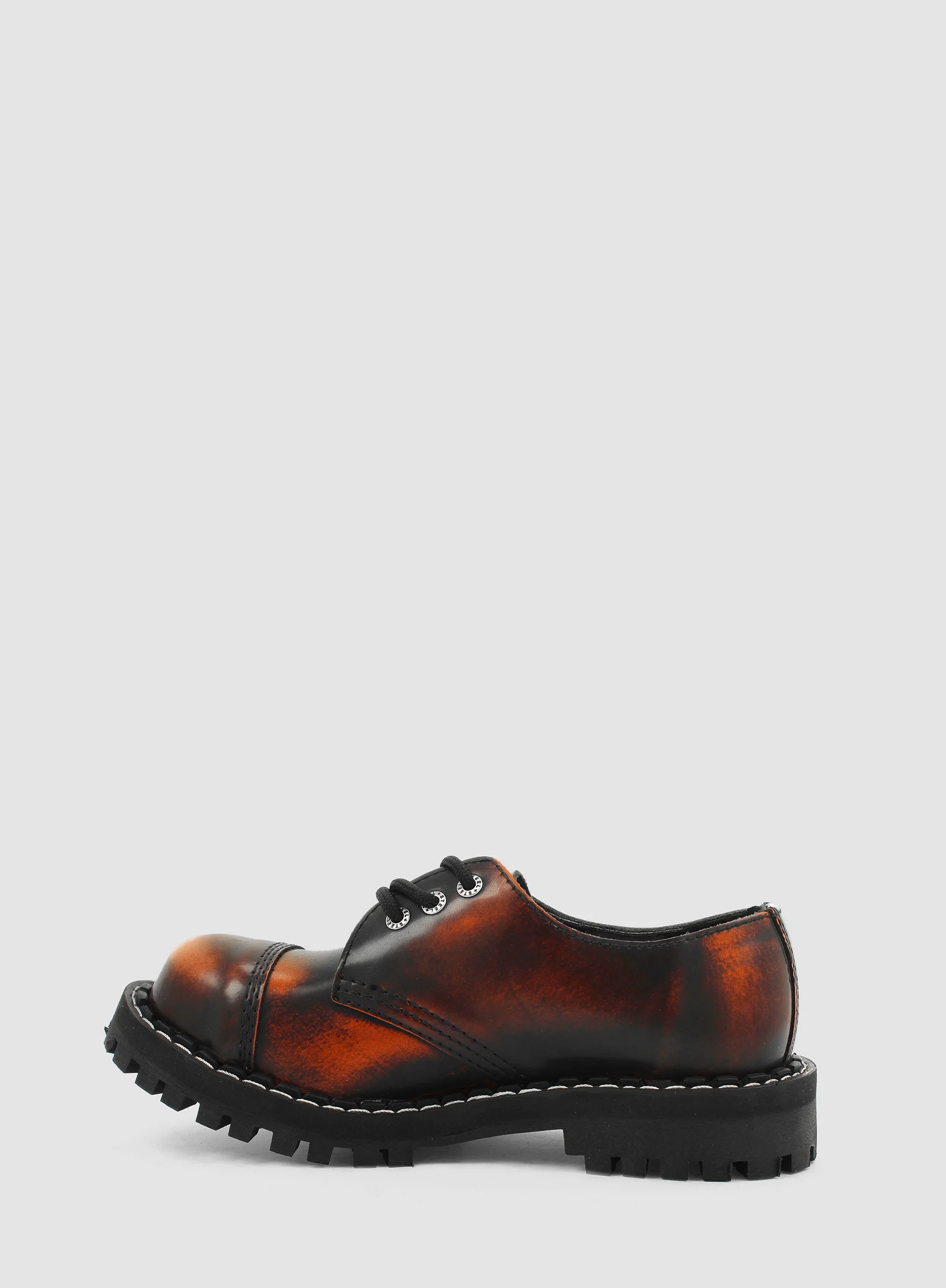 Model znanej europejskiej marki STEEL. Prezentowany model buta to klasyczny GLAN 3-dziurowy w kolorze POMARAŃCZOWYM PRZECIERANYM NA CZARNO (orange/black). Wykonany ze skóry naturalnej z metalowym noskiem oraz czarną gumową podeszwą z wkrętami.