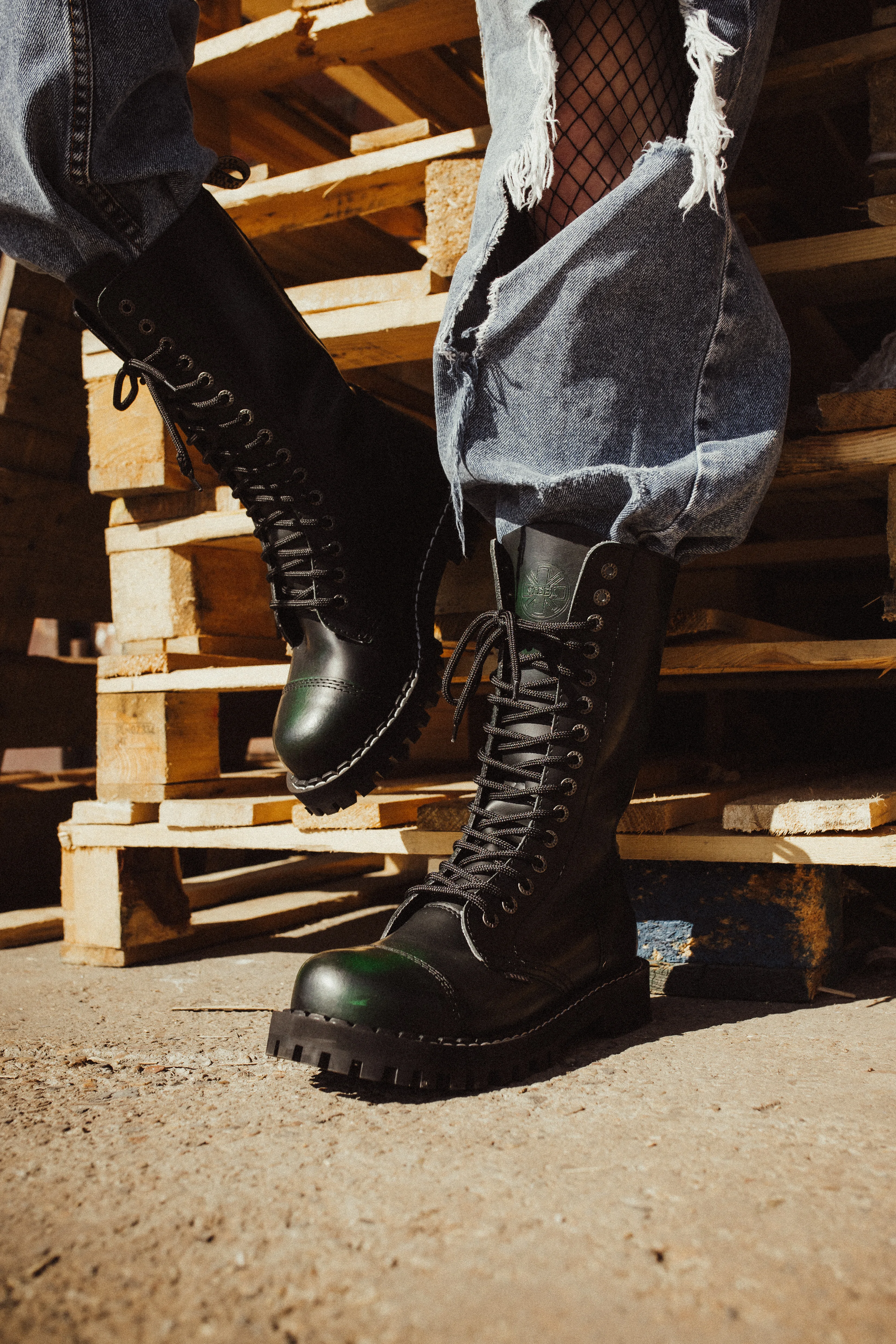 Model znanej europejskiej marki STEEL. Prezentowany model buta to klasyczny GLAN 15-dziurowy w kolorze ZIELONYM PRZECIERANYM NA CZARNO (green/black). Wykonany ze skóry naturalnej z metalowym noskiem oraz czarną gumową podeszwą z wkrętami.