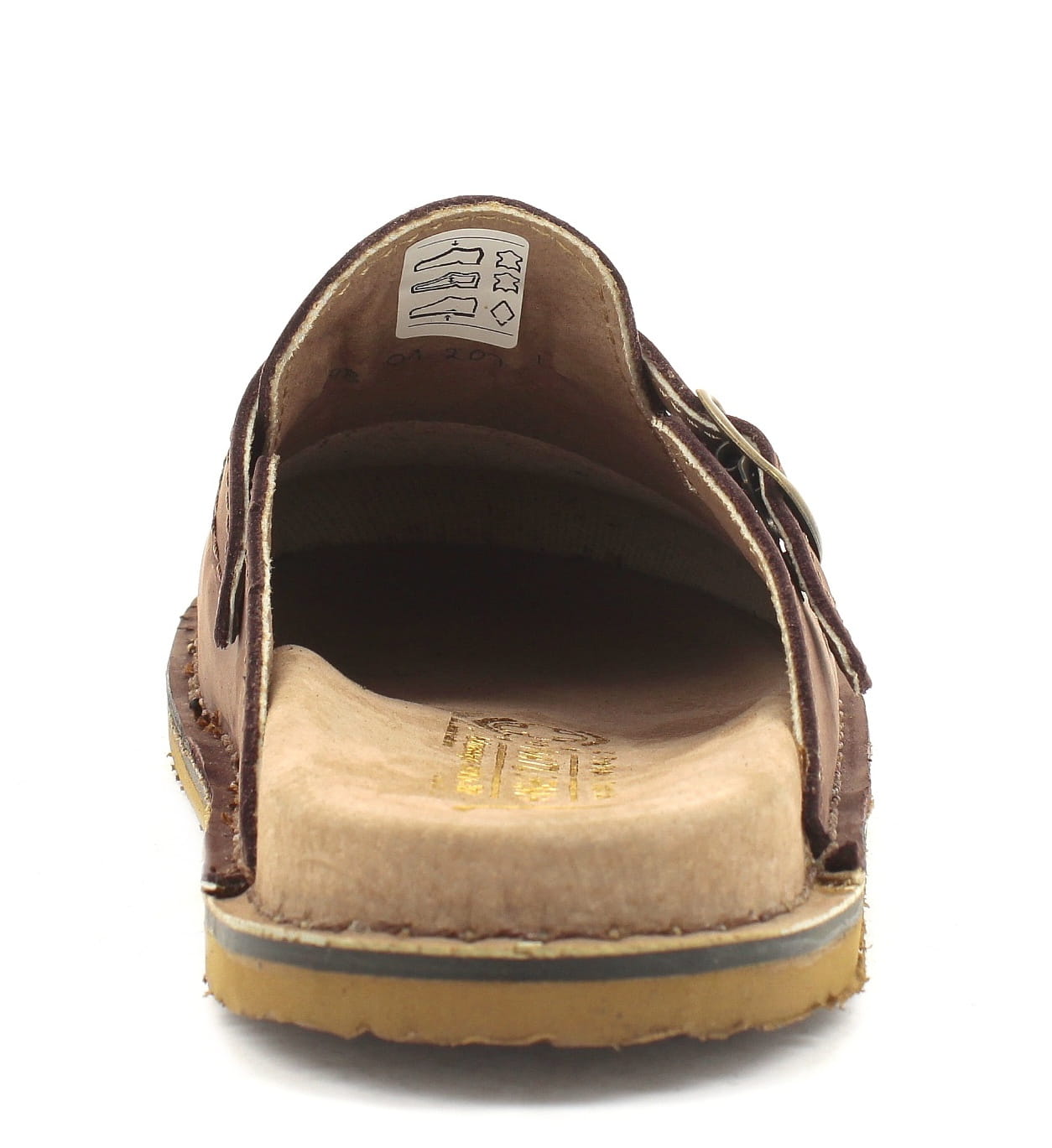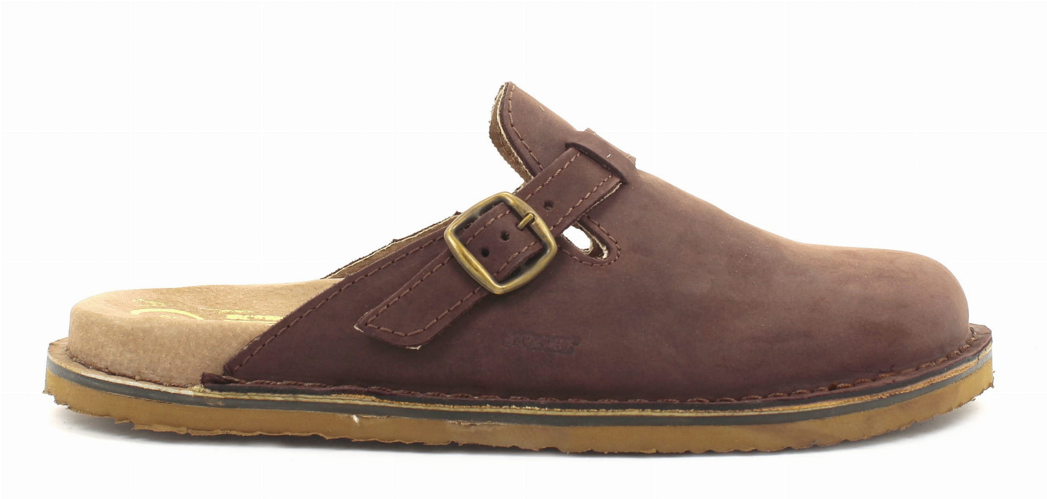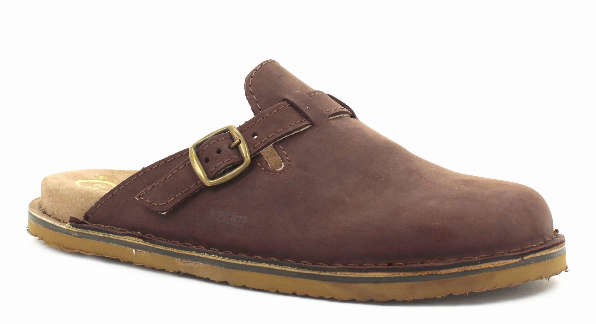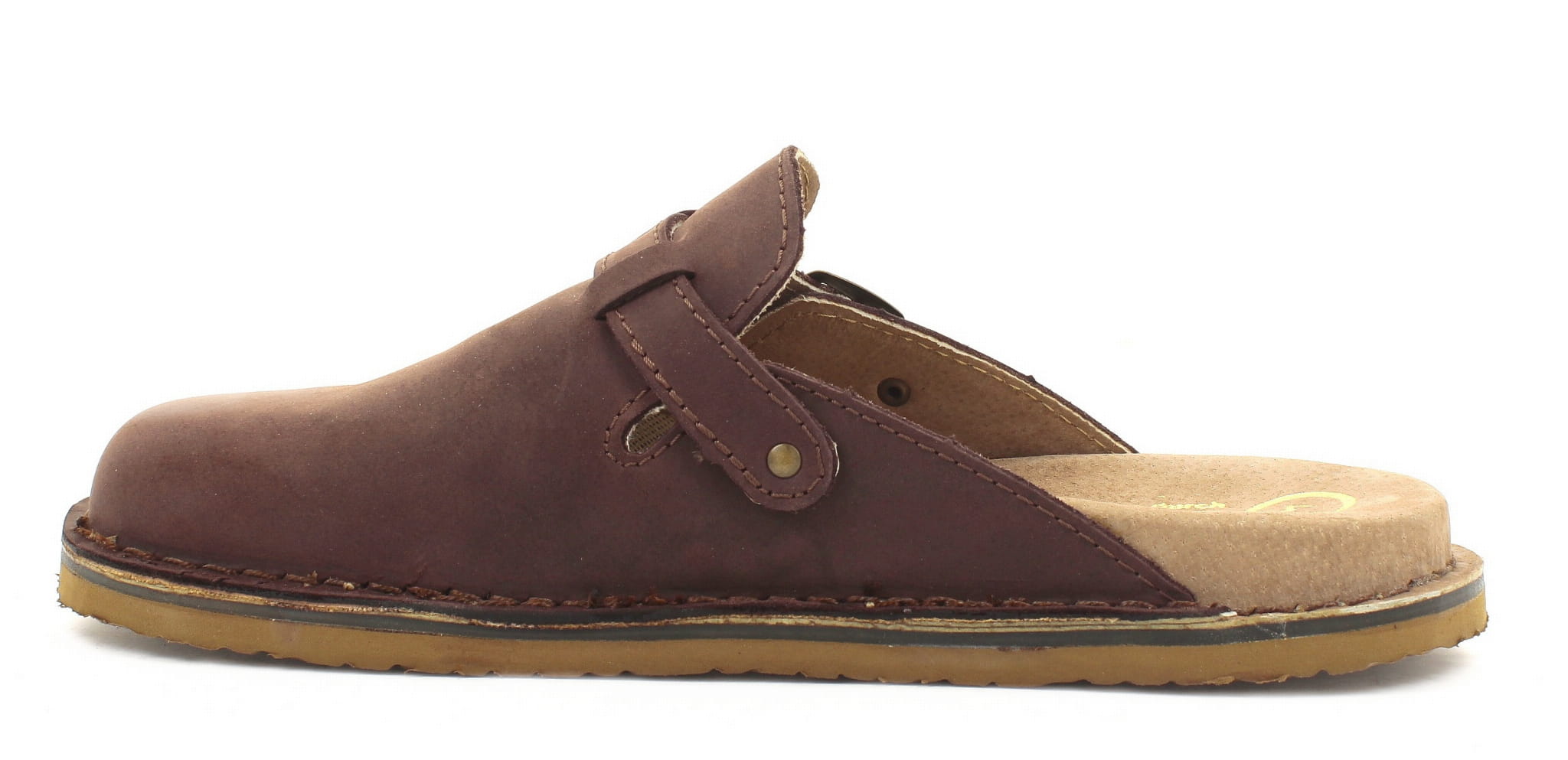 Klapki męskie, wykonane ze skóry. Bardzo wygodne ponieważ wykonane na profilowanym wkładzie, wyłożonym pianką. Regulowany pasek zapinany na klamrę pozwala na zmianę tęgości, ułatwiając dopasowanie klapek do stopy. Wierzch, podszewka oraz wyściółka wykonane są ze skóry naturalnej. Podeszwy klapek posiadają właściwości przeciwpoślizgowe