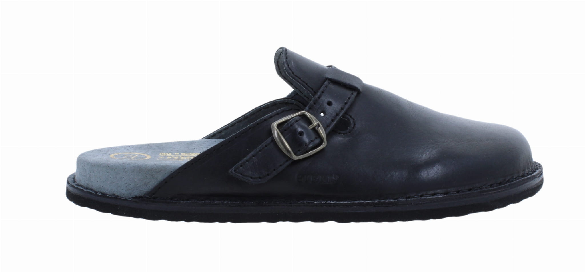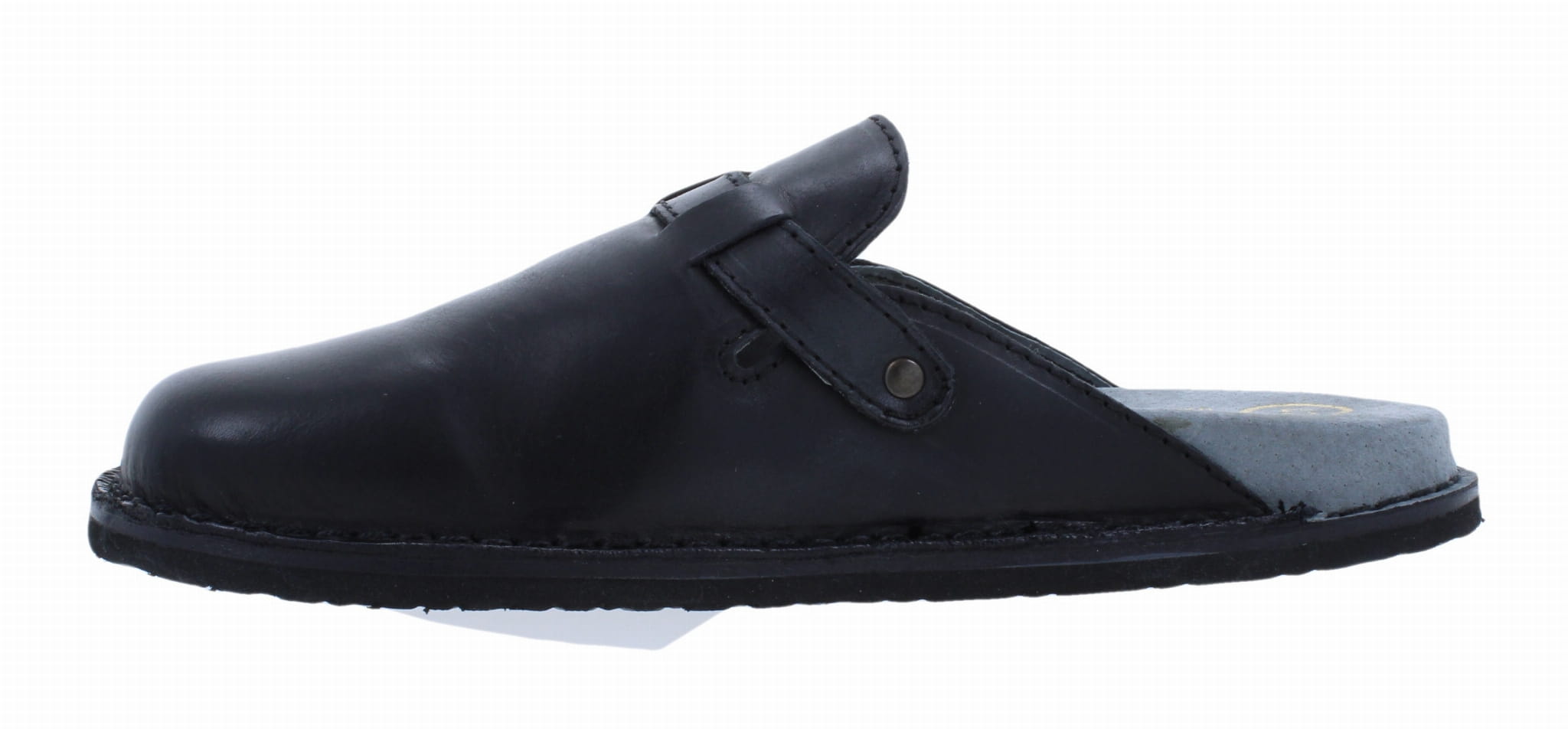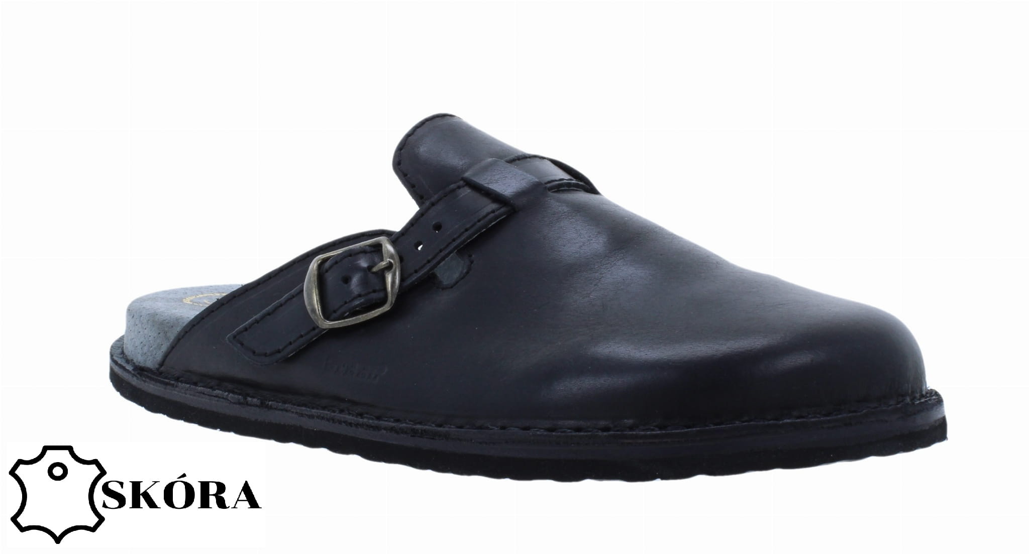 Klapki męskie, wykonane ze skóry. Bardzo wygodne ponieważ wykonane na profilowanym wkładzie, wyłożonym pianką. Regulowany pasek zapinany na klamrę pozwala na zmianę tęgości, ułatwiając dopasowanie klapek do stopy. Wierzch, podszewka oraz wyściółka wykonane są ze skóry naturalnej. Podeszwy klapek posiadają właściwości przeciwpoślizgowe