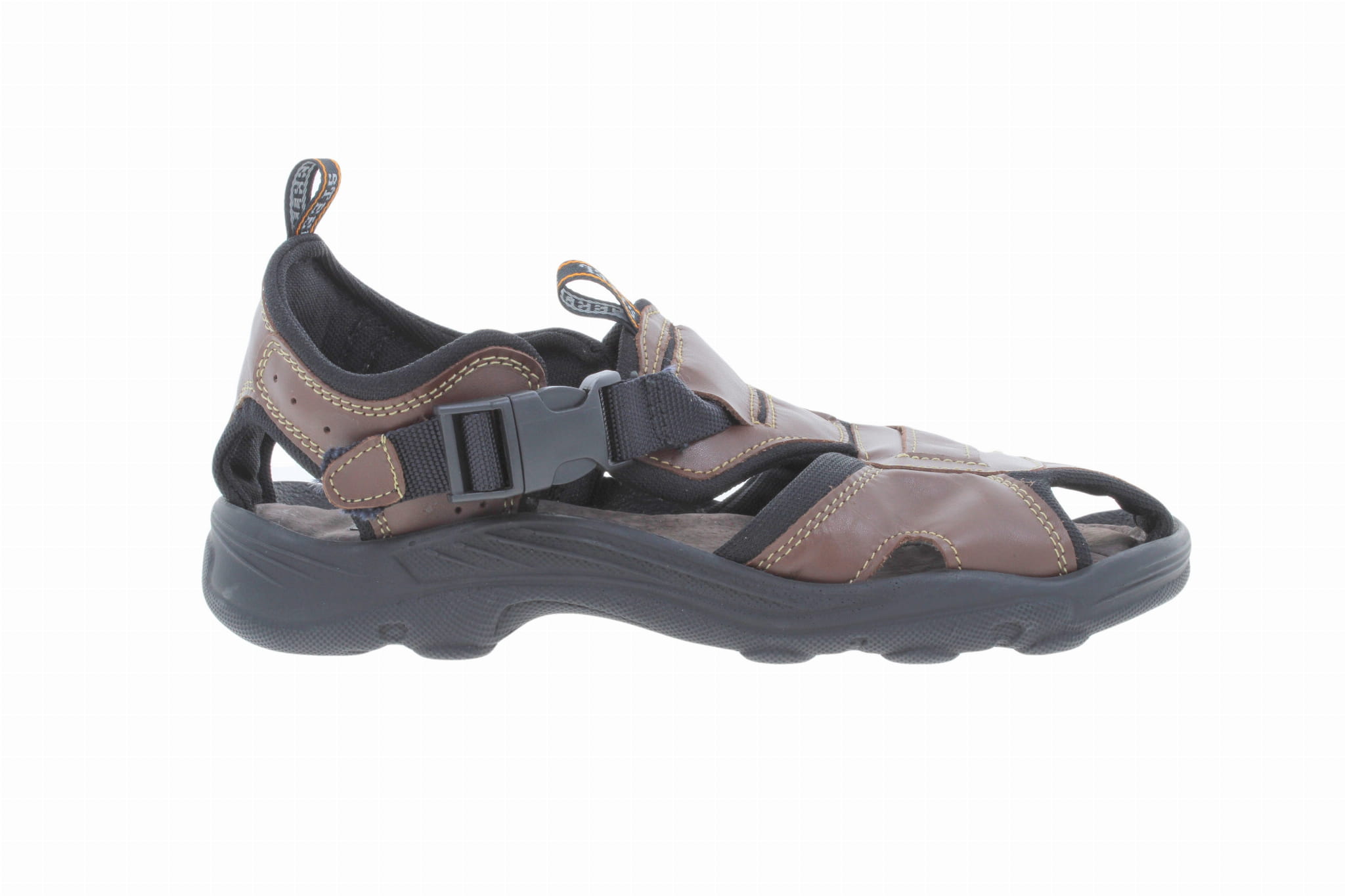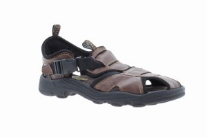Sandały męskie, wykonane ze skóry. Bardzo wygodne ponieważ wykonane na profilowanym wkładzie wypełnionym pianką. Regulowany pasek zapinany pozwala na zmianę tęgości, ułatwiając dopasowanie do stopy. Wierzch, podszewka oraz wyściółka wykonane są ze skóry naturalnej. Podeszwy posiadają właściwości przeciwpoślizgowe